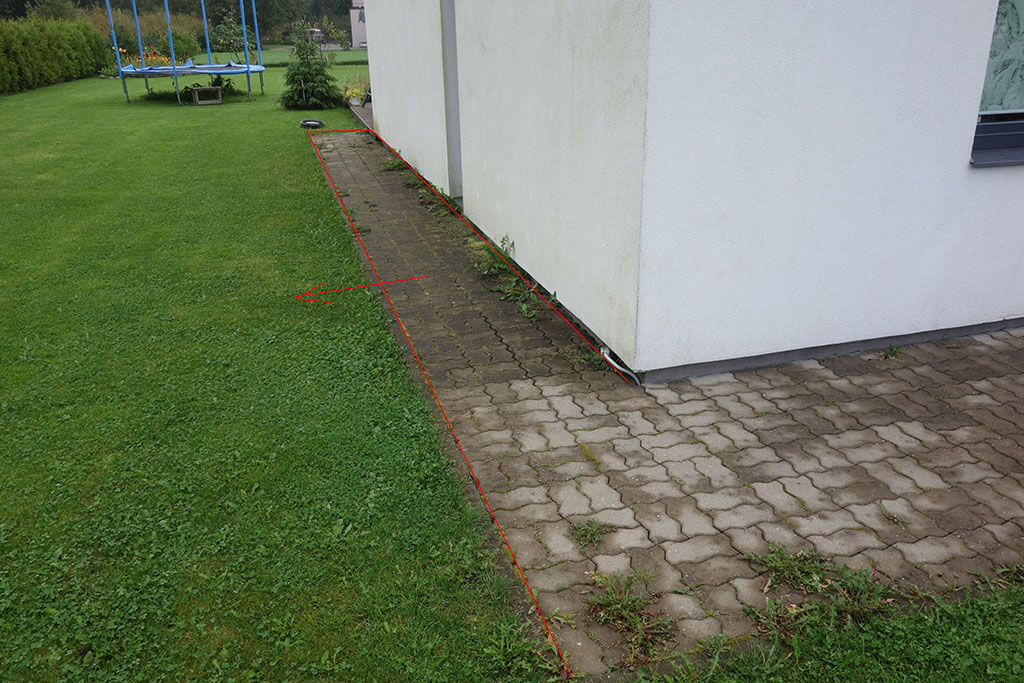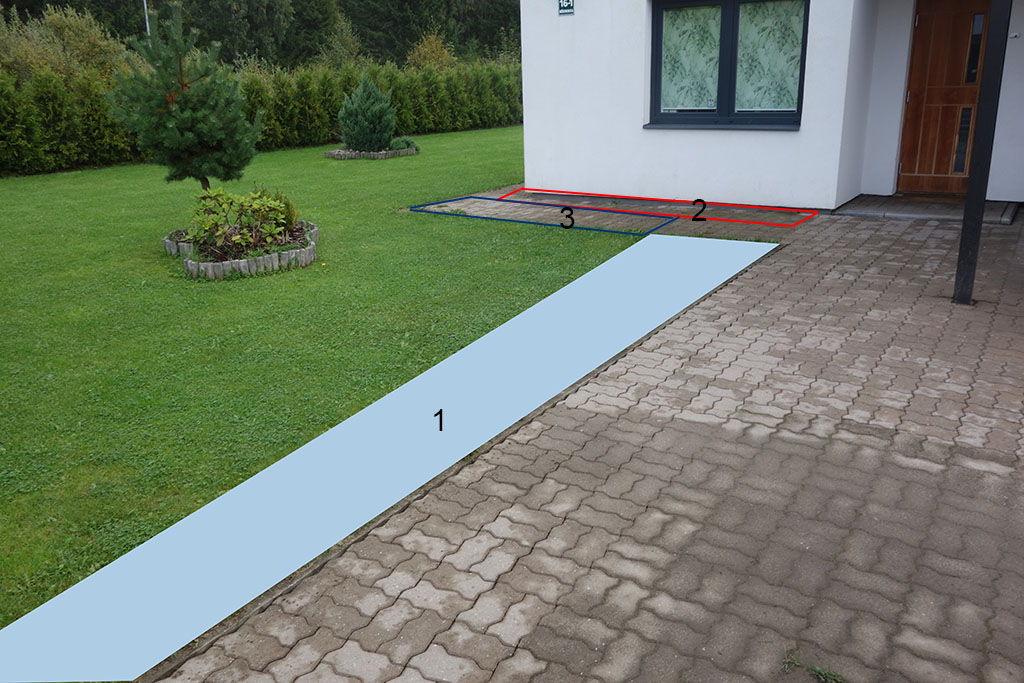Kivi mis on määratud punasega ( ~ 12 m2 ) ülepaigaldada majast 0.5 m, tõsta maast 5 sm võrra jah teha bordüürid mõlemalt poolt.