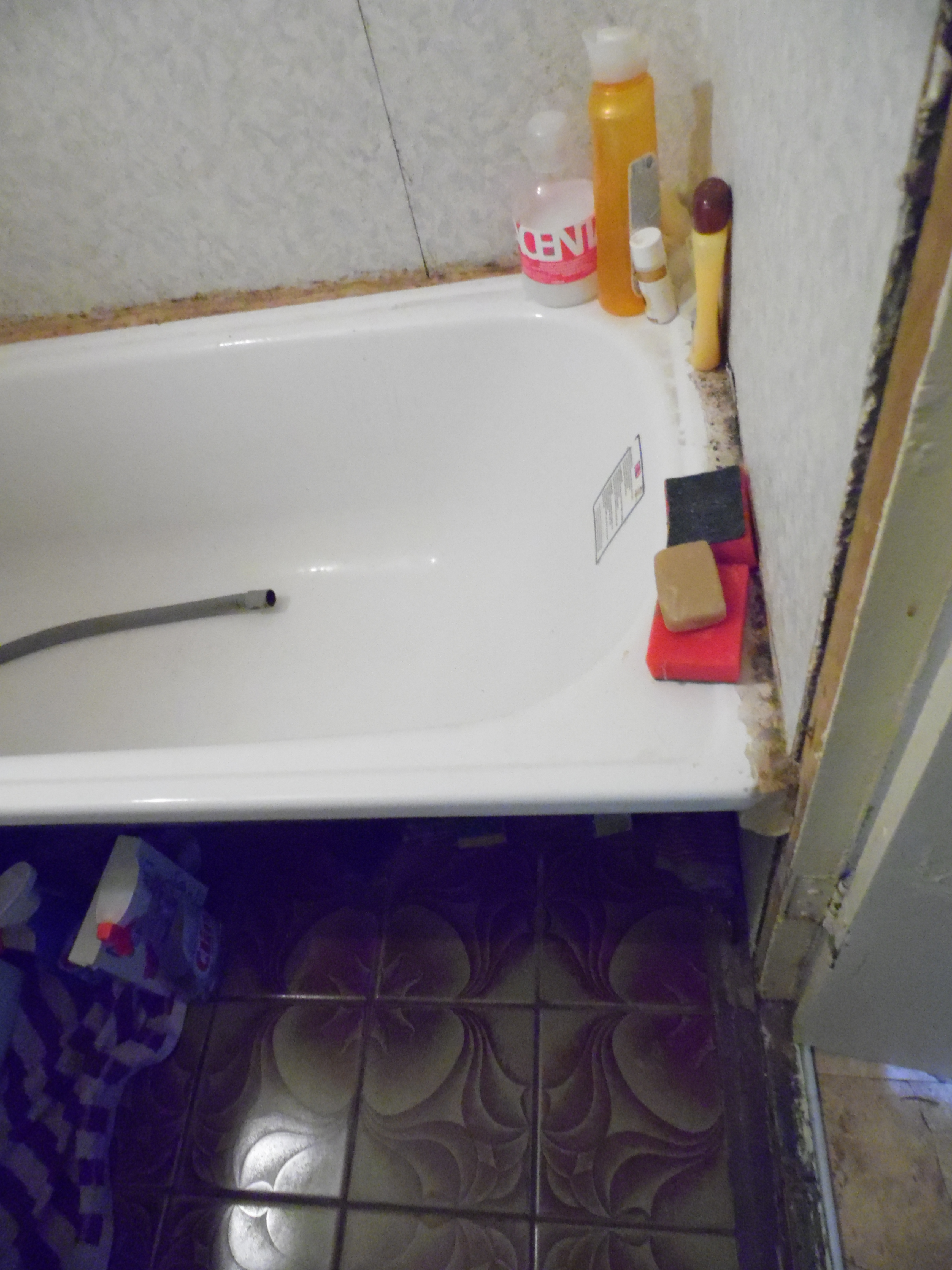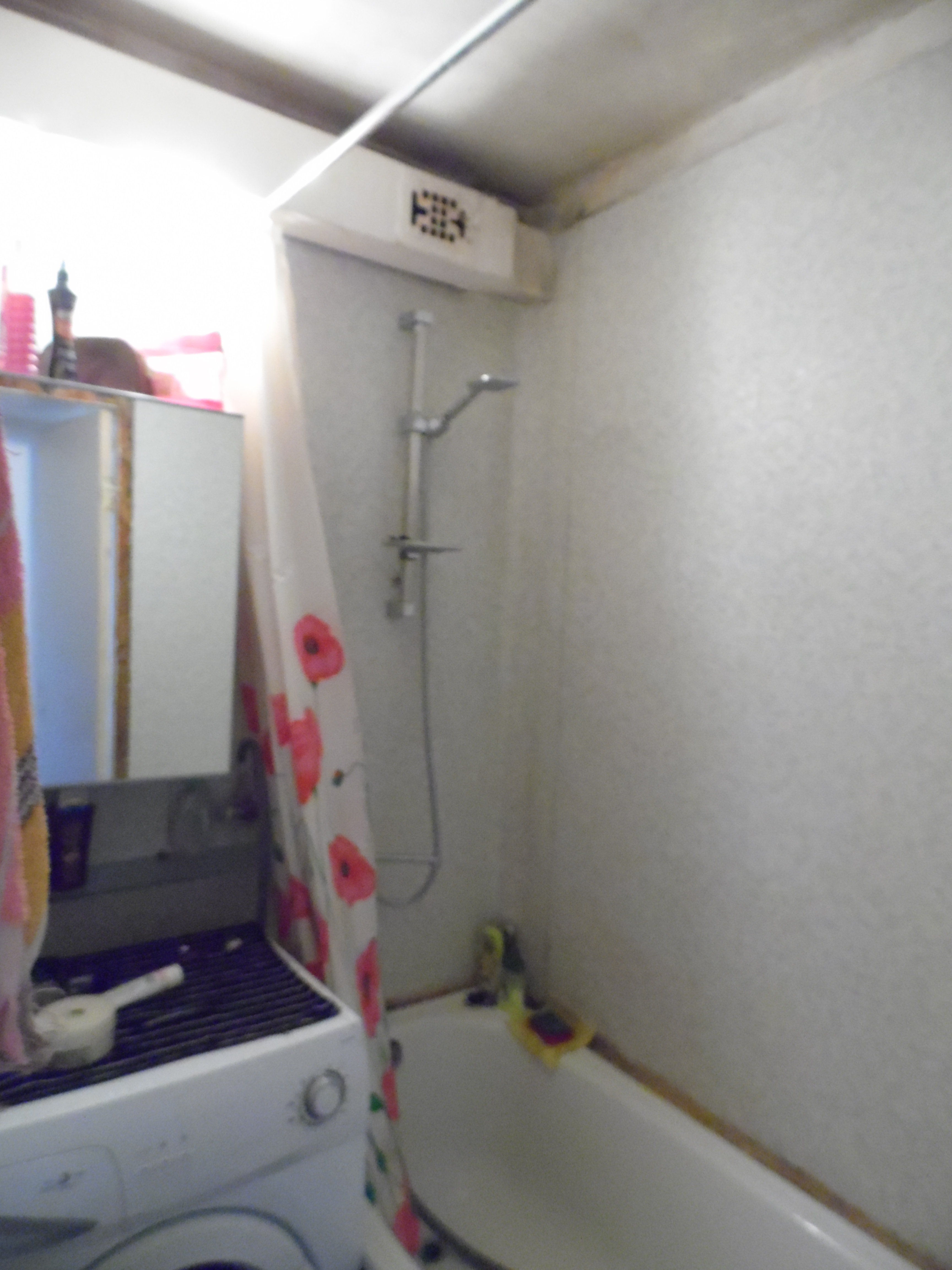 Hetkeolukord: Vannitoas -vann, pesumasin ja peegelkapp, seinas liimitud seinakate, laed värvitud (hallitab)