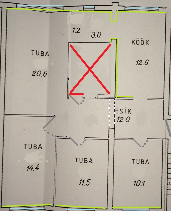 *Ruum 1,2 ja 3 ruutmeetrit ning köögi seinad on kaetud vana eesti algusaegse värviga- ilmselt ei nakku eriti millegagi- vajab spetsiaalset töötlust. Nendest seintes on vaja tüübleid seinast välja võtta (vanade köögikappide kinnitused).