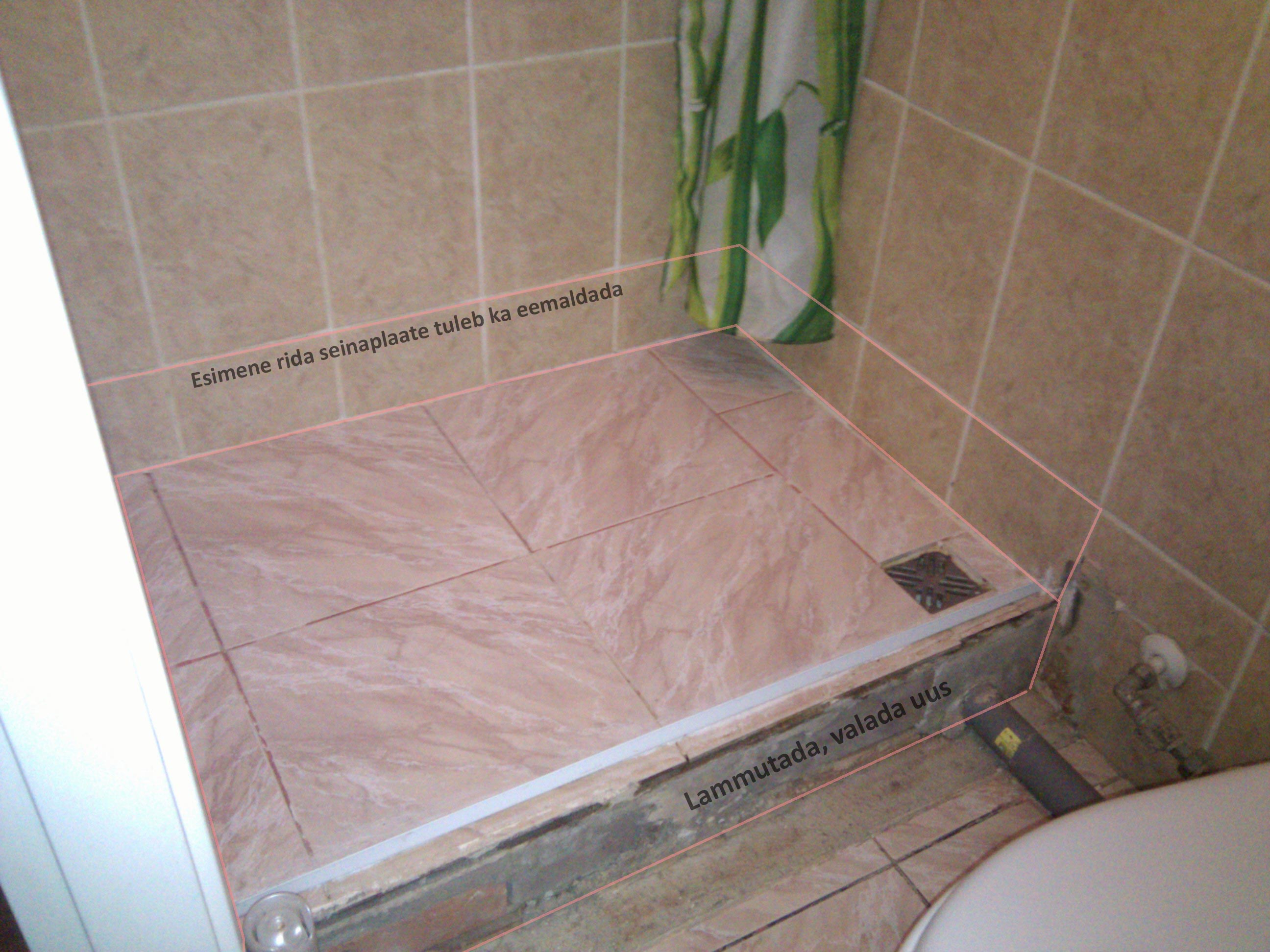 Dušinurga aluse lammutus (ei ole põrandaga kokku valatud, vt pilte) (70x94cm ala)