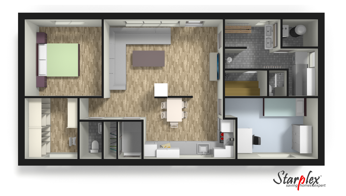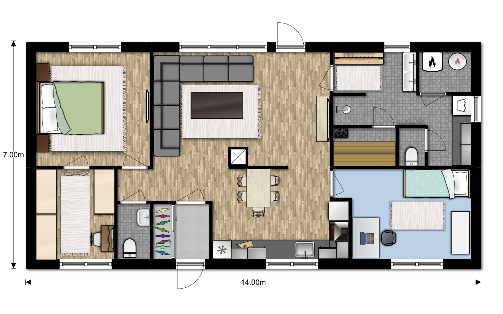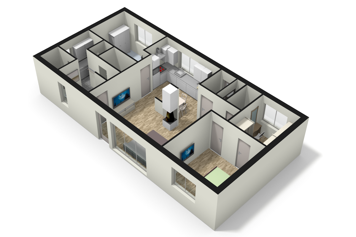 Põrandad katta laminaatparketiga, wc ja pesuruum ning katlaruumi põrandad ja seinad plaatida (plaadi hinnaklas ca 12€/m2). PVC välisuks ja aknad 3x klaaspaketiga. Paigaldada õhksoojuspump 1tk elutuppa. Paigaldada wc potid 2 tk ja kraanikausid koos kraanidega 2 tk, el. Boiler 200L, valged siseuksed, kõik torutööd. Sauna ehitus + el.keris.