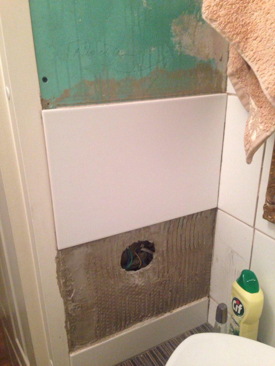 Vannitoas on vaja puhastada osaliselt vuugid pruunikast vuugitäitest, uputada pesumasina vee äralasketoru seina, plaatida umbes 30 plaati suurusega 40*20, täita vuugid valge vuugitäitega, kinnitada vanni külge panel.