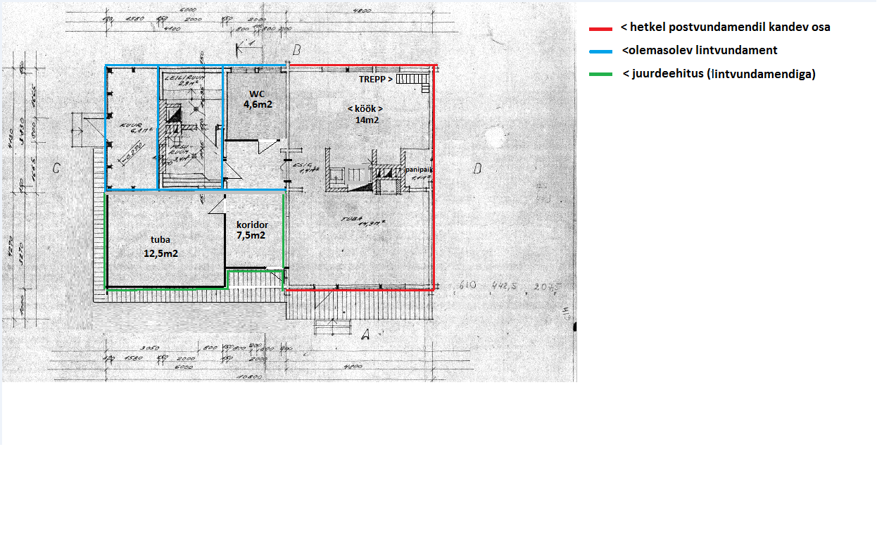Soovin olemasolevale kahekorruselisele majale, mis kannab osaliselt postvundamentidel teha ümber lintvundament (joonisel punase joonega osa). Osaliselt tuleb teha lintvundament ka juurdeehitusele (joonisel rohelise joonega osa). Osaliselt on majal lintvundament olemas (joonisel sinise joonega osa). (NB! maja jääb kandma edaspidi ka olemasolevatele postvundamentidele). Tööde tegemisel on ligipääs maja väljast ja seest kuna vanad põrandad on ära lammutatud ja tulevikus tuleb sisse plaatvundament. Olemas on elekter ja vesi.