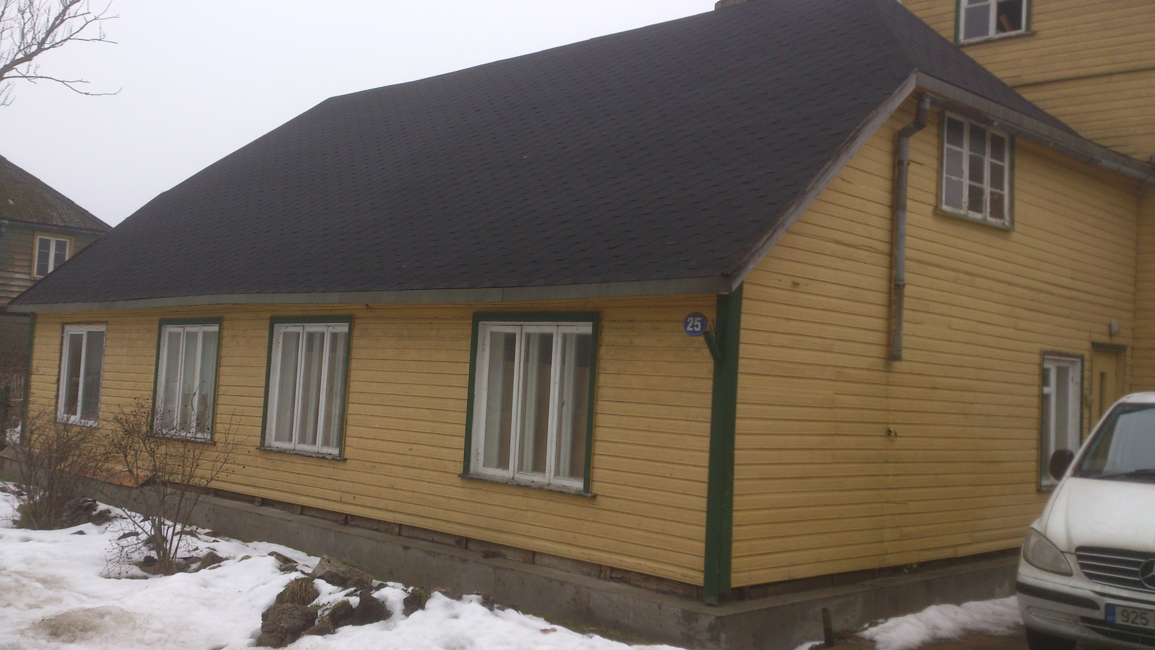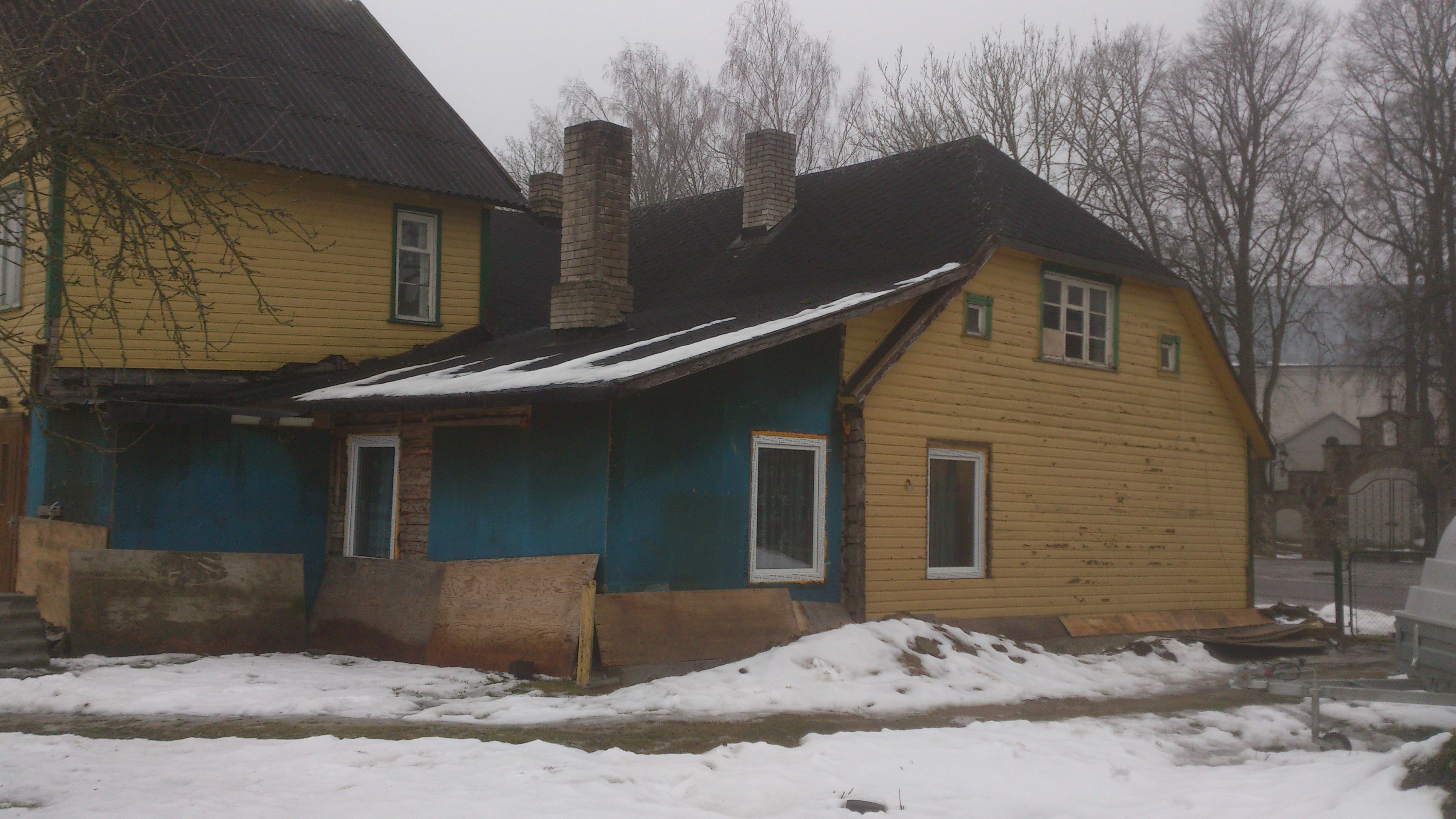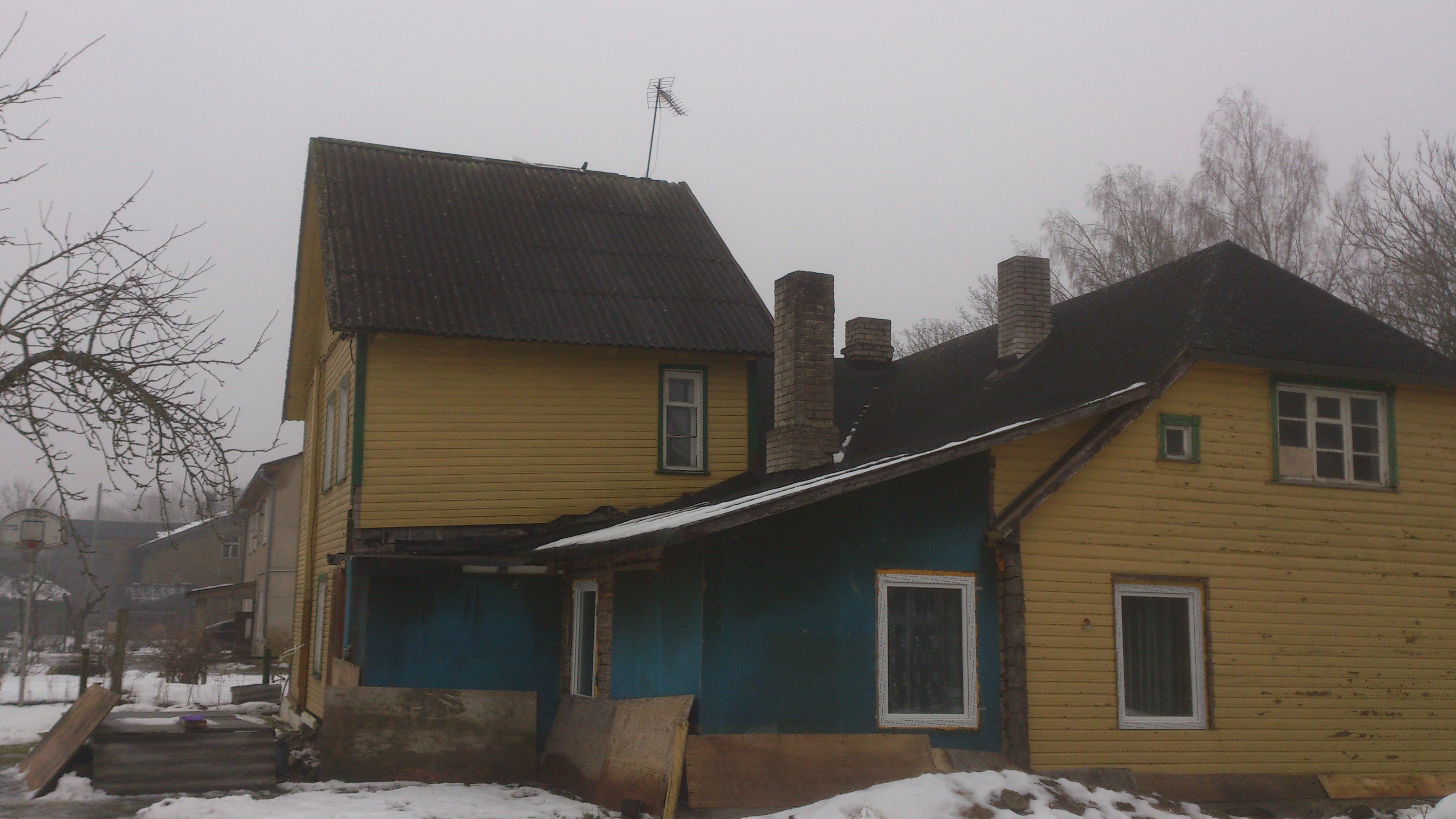 Vanale katusele paigaldada 50x100, aluskatte , distants , plekk, korstna plekid 2tk. imurite läbiviigud 3tk. Pildil olev kõrgema majaosa katuse kalde muutmine lamedamaks.
