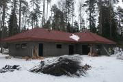 olemasolevale väilisseinale(Narva plokk) peale laduda kaks rida fibo plokki ca 50jm ja seejärel 10armatuurist betoonvöö (100x100). Hoone keskel olev kandesein tuleb samuti kõrgemaks laduda 2,5meetri võrra ja ca15 meetri pikkuselt. (fibo)Teha sarikad 70x200 prussist, 8m pikkused ja paigaldada sammuga 900mm. (17tk).Sarika peale tuuletõkke plaat->liist->aluskate->roov->klassik plekk katus.