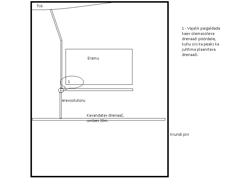 Vihmaperioodil ja kevadeti on tõsiseks mureks kõrge pinnavesi. Vajalik oleks paigaldada perforeeritud toru koos kanga ja killustikuga. Kokku umbes 20m pluss lisaks äravooluks umbes kaheksa meetrit toru. Vajalik paigaldada üks kaev ja ühendada olemasoleva äravooluga. Üle jääva pinnase äraviimise peaks korraldama hanke võitja.