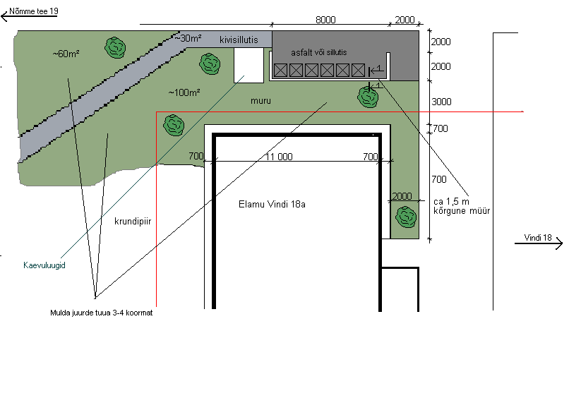 Prügikastide aluse ehitus koos fassaadikivist müüriga, haljastus joonisel märgitud mahus, kõnnitee ~30m²