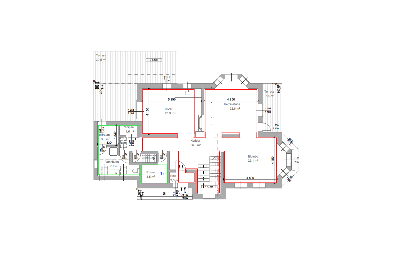 - Projekt/teostusjoonised, arvestades mõistliku kontuuri pikkust ja kuju joonisel nii rohelisele kui punasega tähistatud alale. Sinisega tähistatud "-1k" viitab küttesõlme alguspunktile keldrikorrusel.