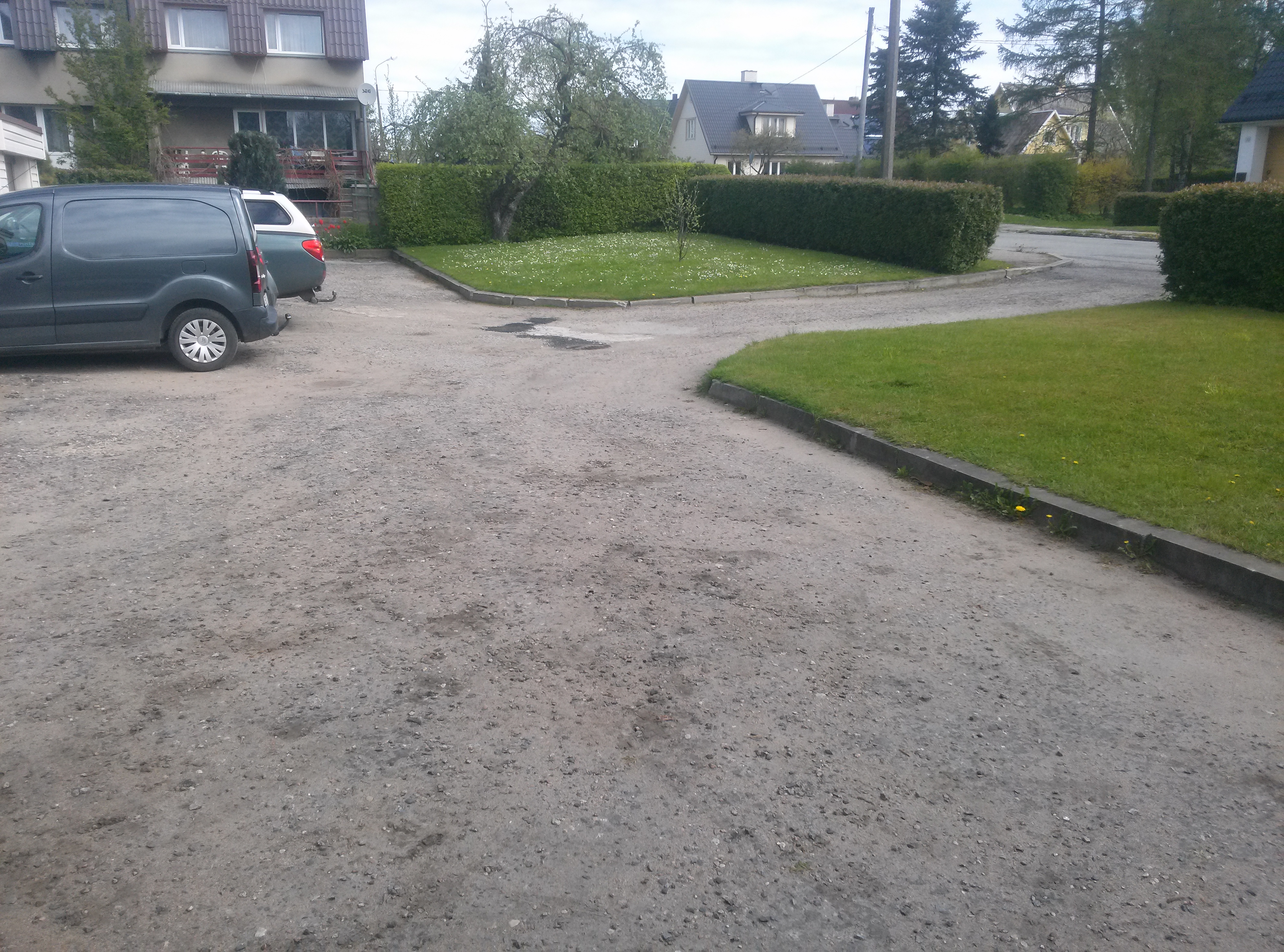 Ligikaudu 360 m2 tänavakivi ja 30 jm äärekivi. Vana katte ja vajadusel aluse koorimine ning uue lisamine. Kallete tegemine sadeveekaevudesse. Parkla sõiduautodele.