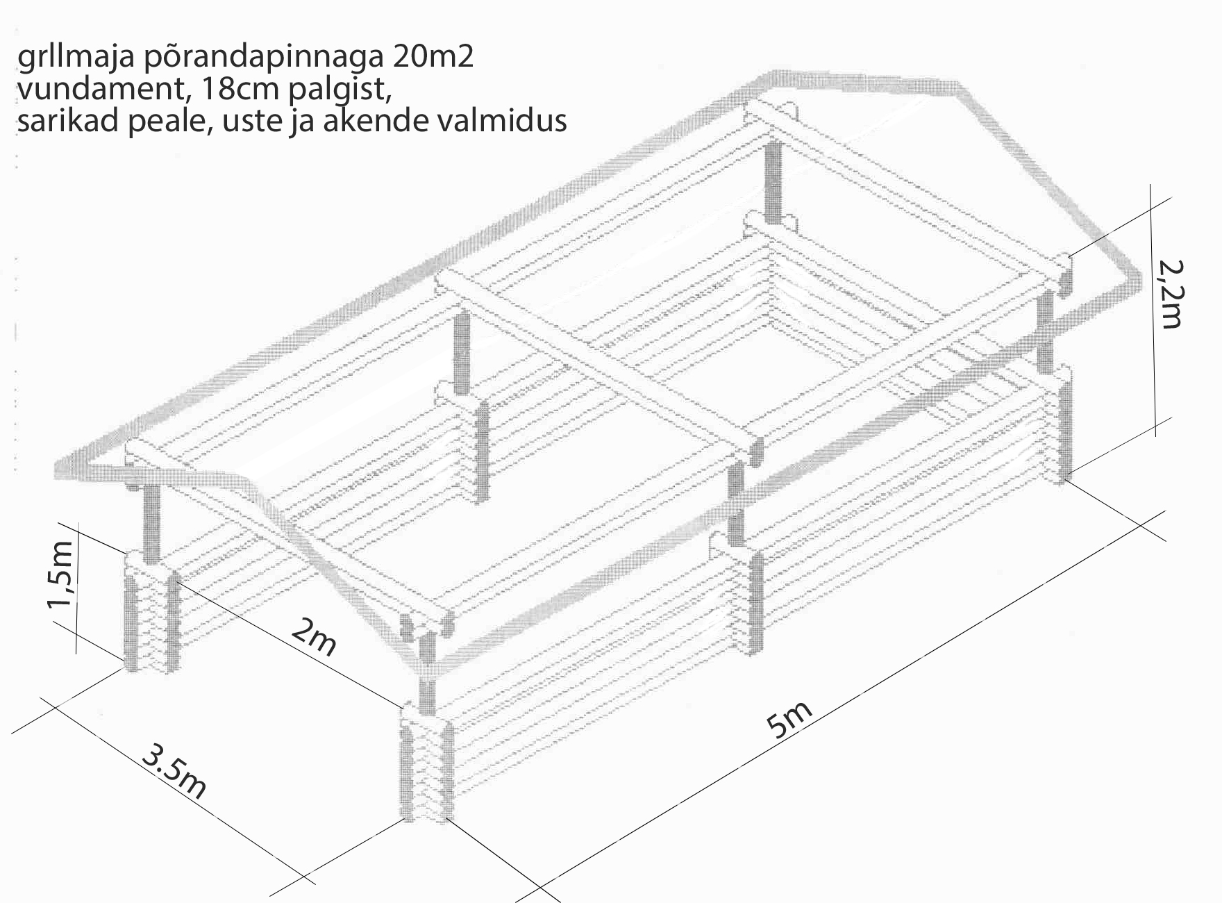 Soovin leida korralikku ehitajat või firmat palkidest grillmaja ehitamiseks. Materjal ja töö on pakkujalt. Töö sisaldaks järgmist: vundament(tõenäoliselt sobib postvundament), palgiosa paigaldus(18cm palgust), laudpõranda paigaldus, sarikate paigaldus(laudist pole vaja). Ehitisel peab olema akende ja uste paigalduse valmidus. Aknaid, uksi ja katust paigaldada pole vaja. Põrandapinda ca 20m2. Täpsem visand lisatud pildina.