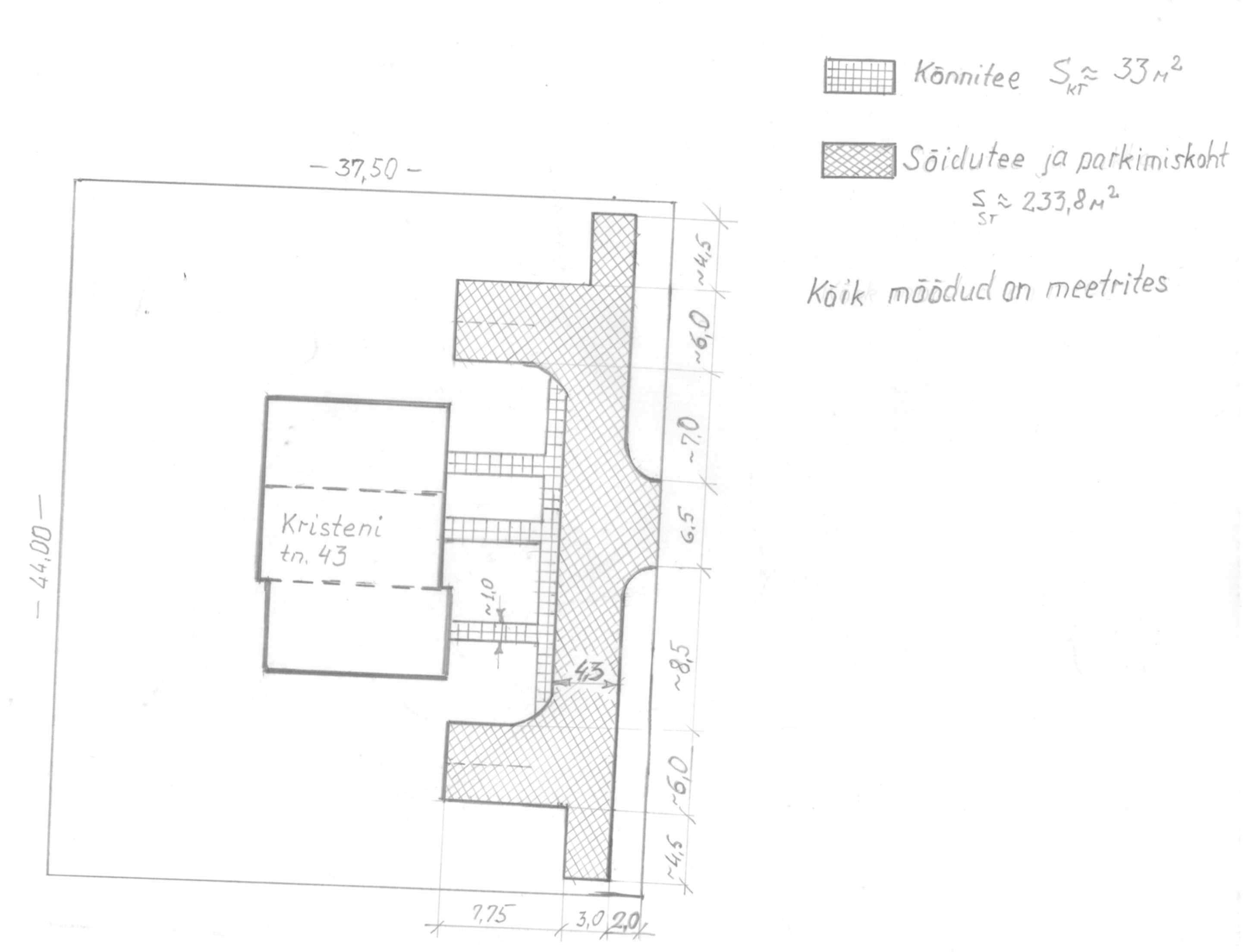 Ridaelamuboksi ees autotee alune pind on 234 m2 ja eelnevalt on seal gruntkate. Lisaks tuleks parandada juba unikividega kaetud jalgeed maja ees. Täpsemalt kõik lisatud joonistelt