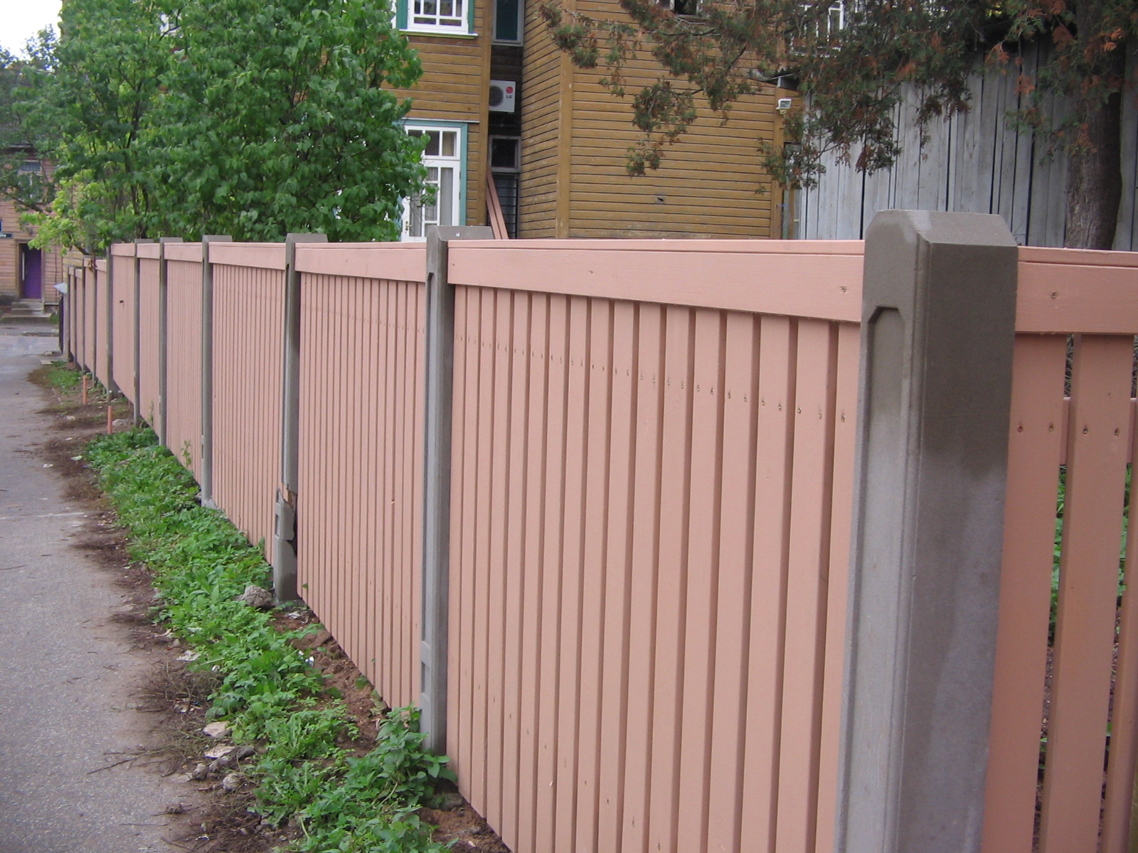 Sooviks vertikaallippidega ning veelauaga värvitud puidust piirdeaeda betoonpostidega ja betoonsokliga eramajale kogupikkusega u. 30m.
