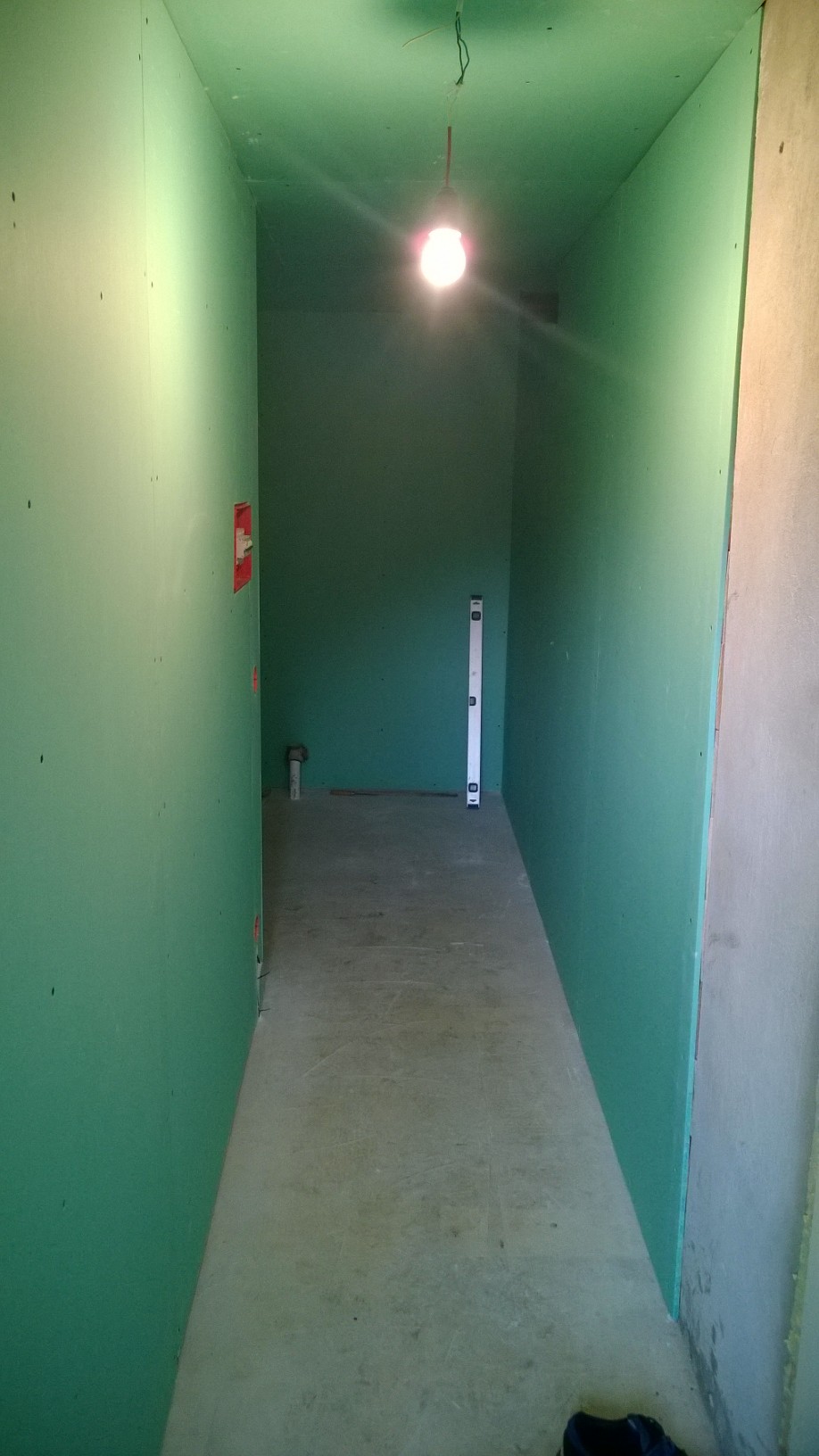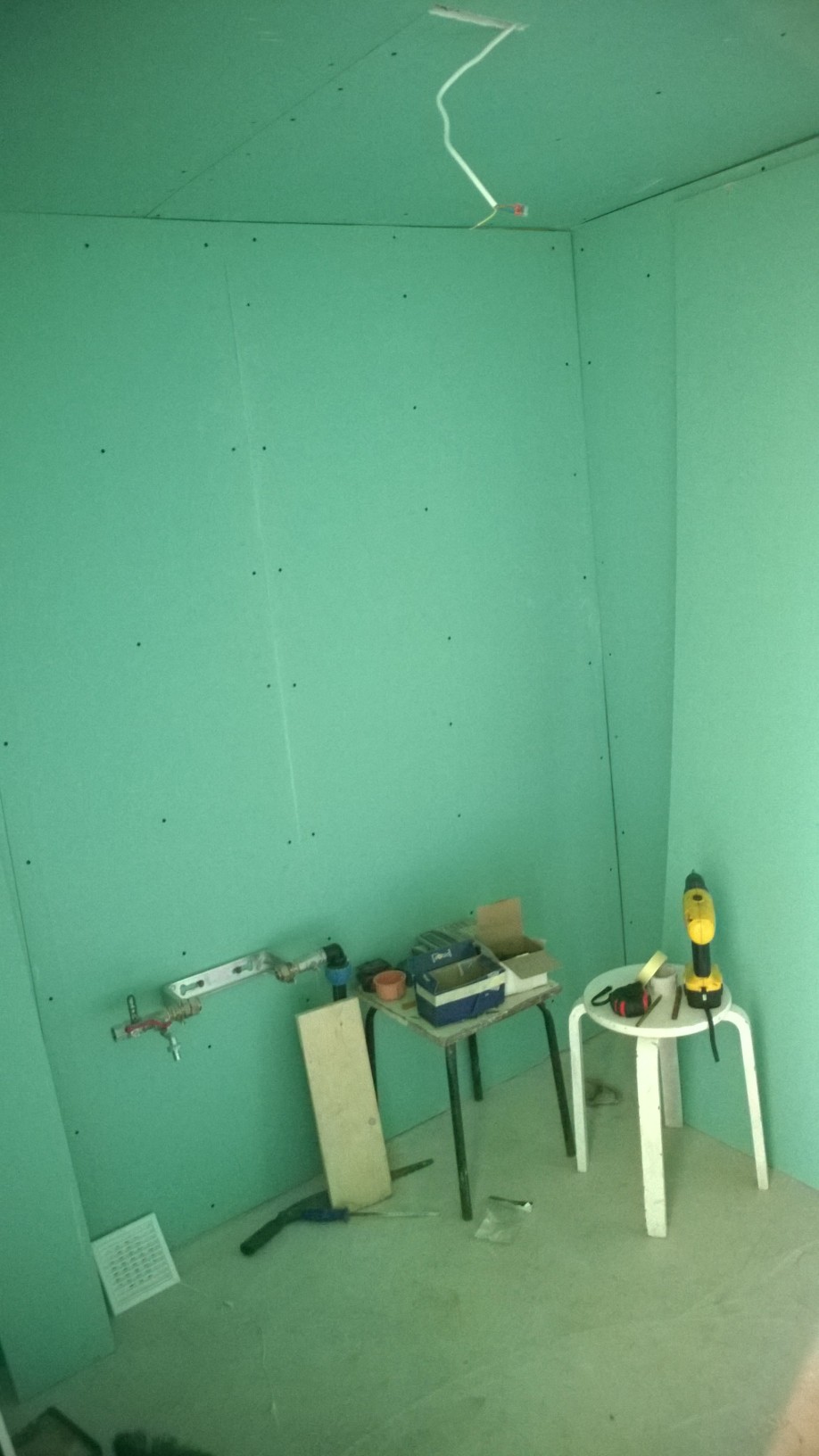 32m2 seinaplaati ja 8m2 põrandaplaati. Seinas on kipsplaat. Sein ja põrand on vaja niiskustõkkega üle teha. Põrandal on valatud betoon. Põranda trappi ei ole ja kaldeid anda pole vaja. Plaadid on olemas. Hanke võitja pool plaadisegu ja hüdroisolatsioon.