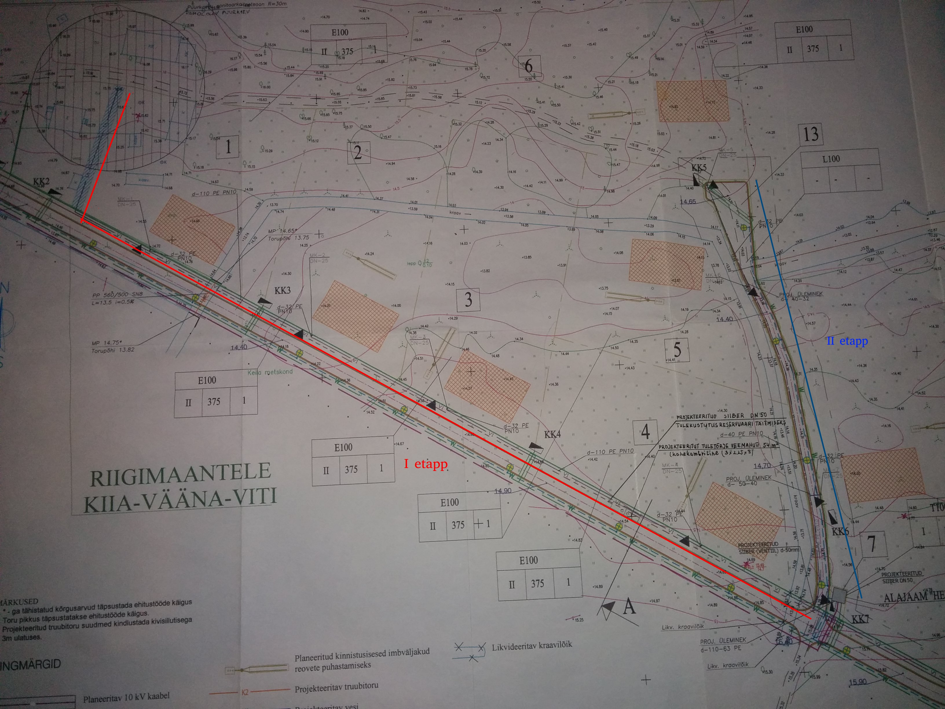 Veetrassi rajamine elamukinnistute (11tk) piirideni, trassi toruga, D-110 PE PN10, kogupikkus ca 1030m, sügavus 1,5 - 1,8m.