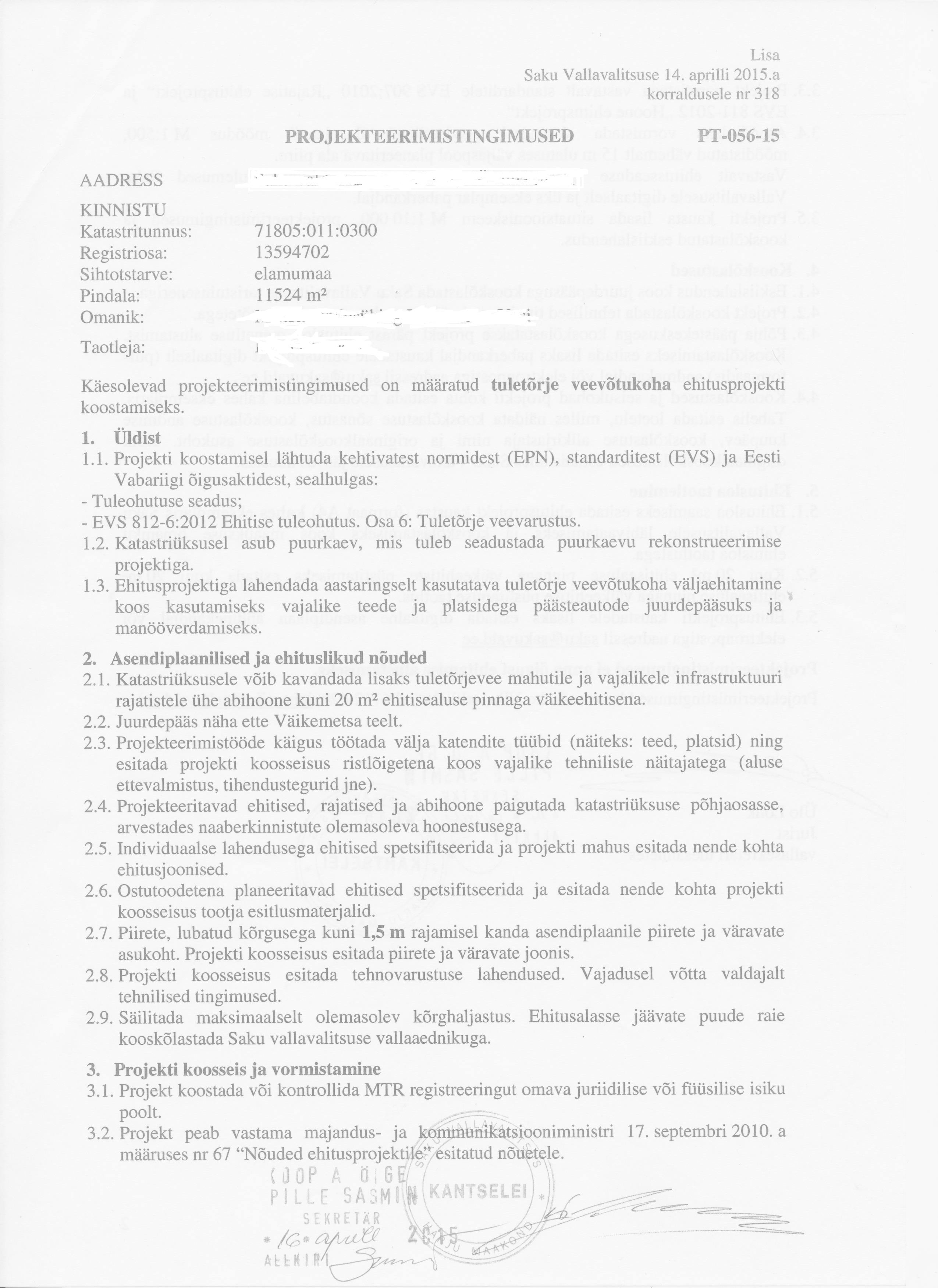 Vastavalt projekteerimistingimustele projekti koostamine.