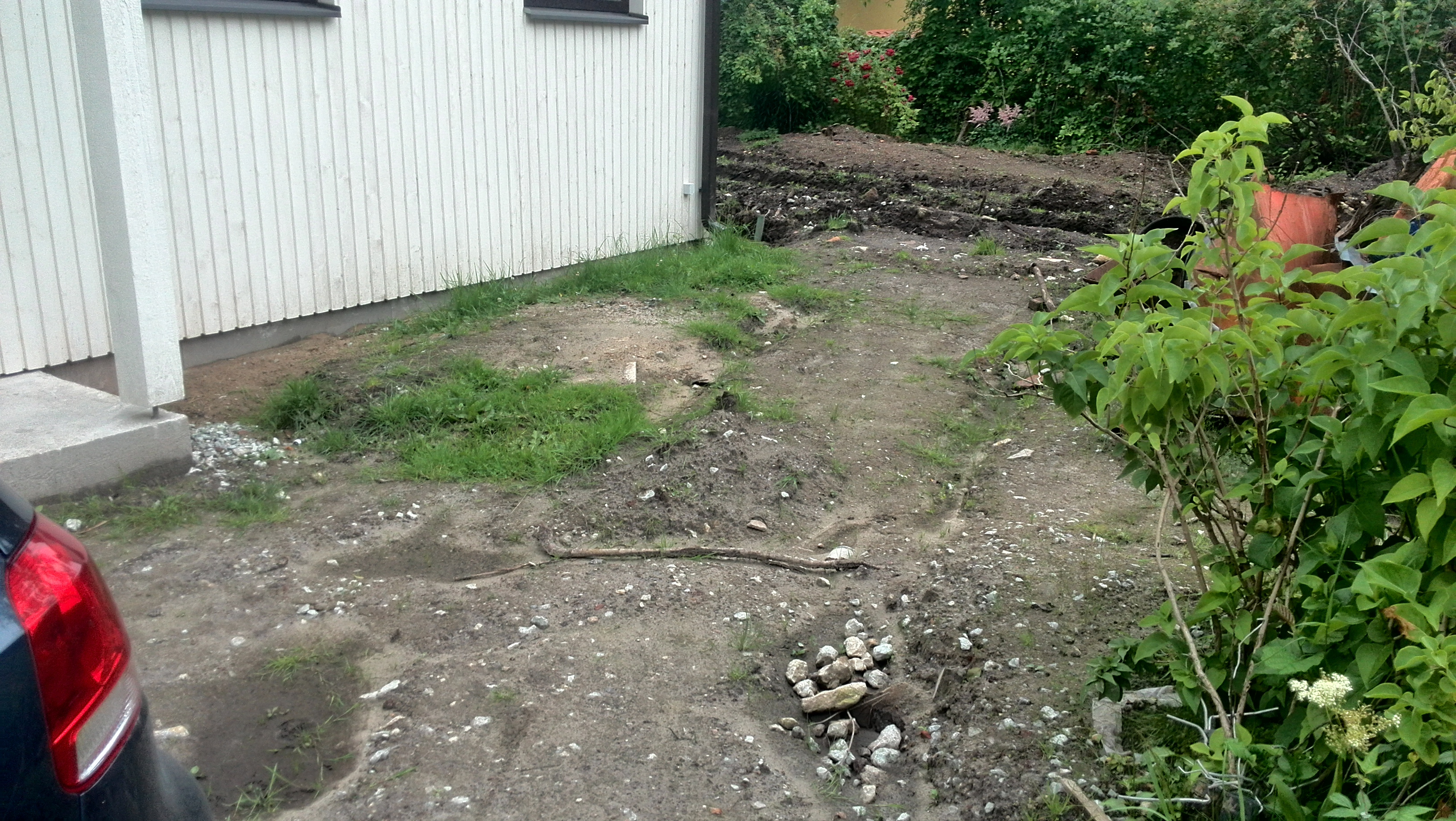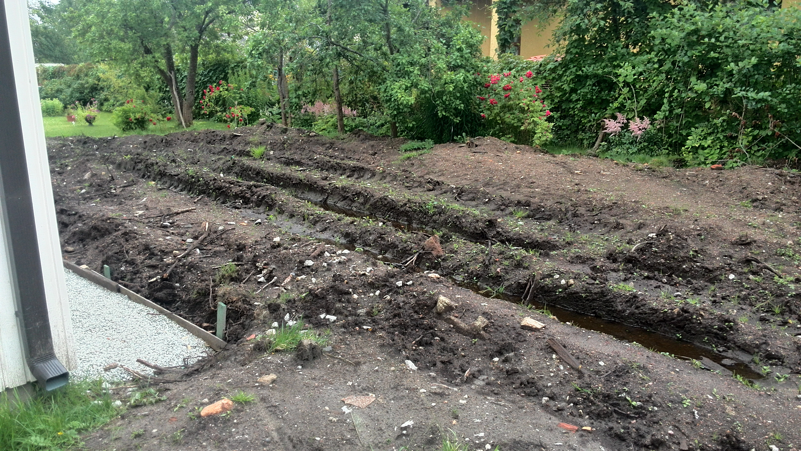Rajatud eramu vundamendi alt välja kaevatud pinnase koorimine, kasutuskõlbmatu pinnase utiliseerimine, platsi tasandamine, muru istutamiseks vajaliku mullakihi rajamine, muru istutamine.