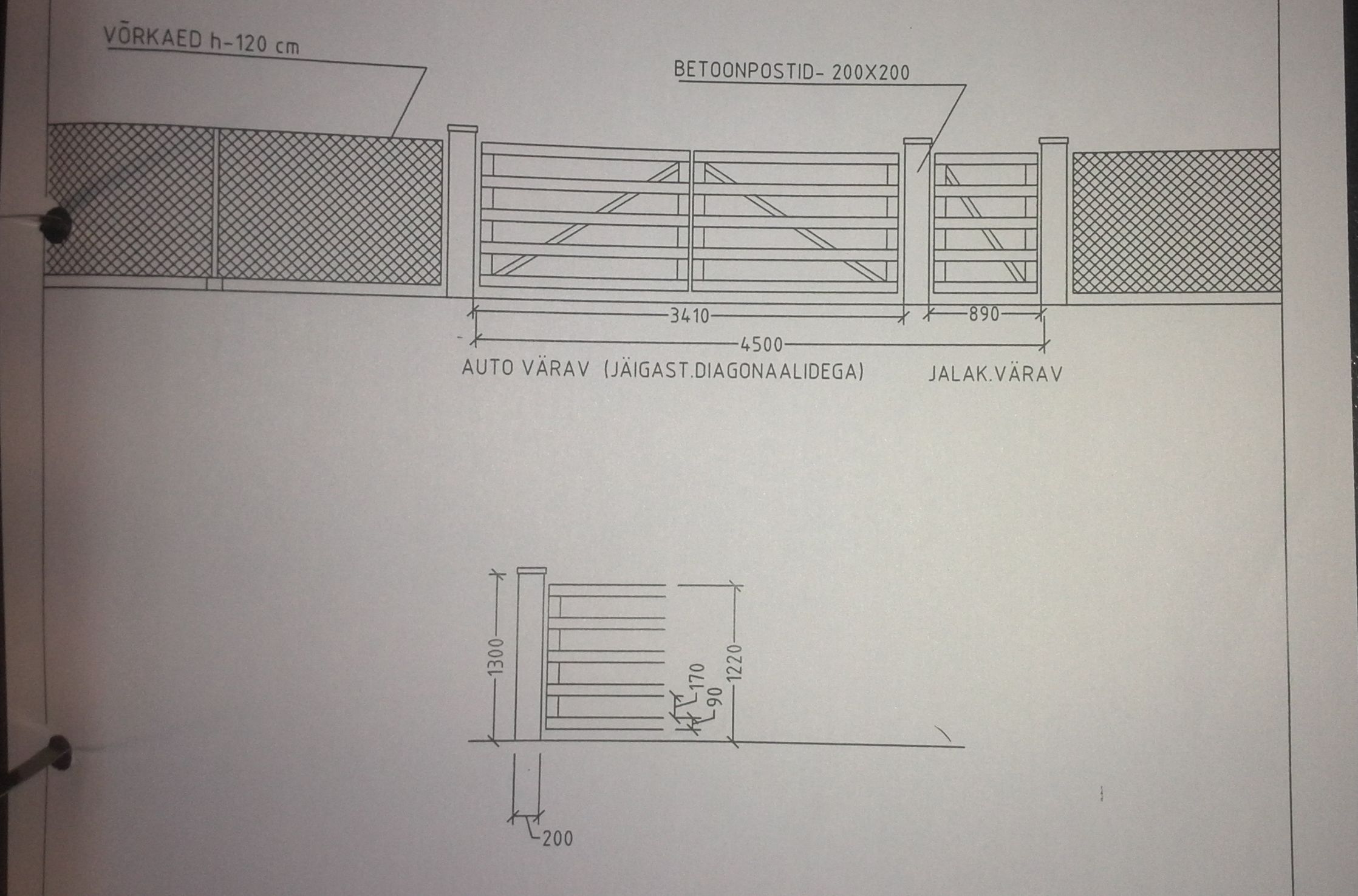 Eskiisprojekti järgi on tegu 23m pikkuse võrkaiaga, h=120cm, milles on 1 jalgvärav (laius ca 90cm) ning autode sissesõiduks tiibvärav laiusega ca.3.5m