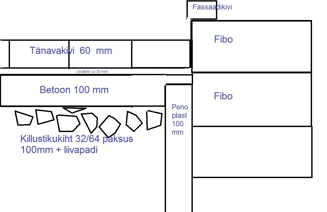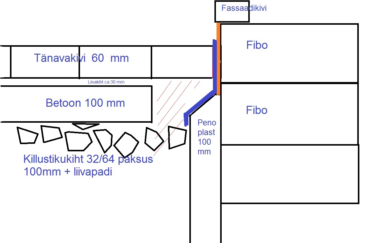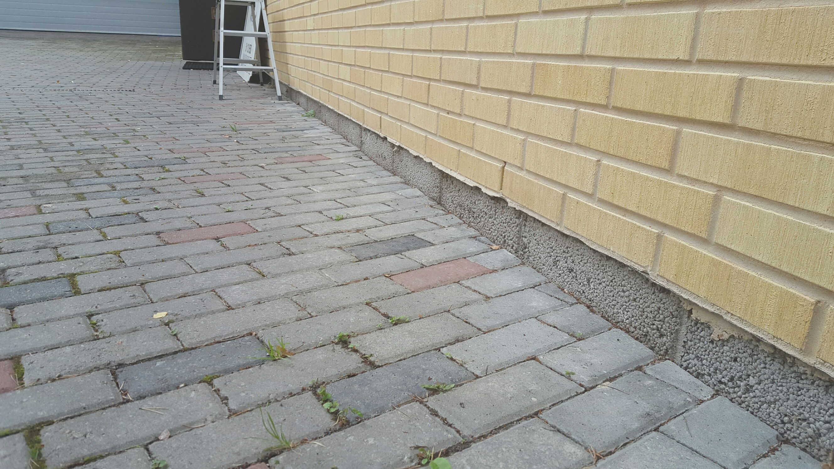 Vastavalt joonisele nr.1 valati tänavakivialune betoon kuni majaseinani ilma veetõket tegemata. Vaja on 1. Eemaldada tänavakivid, 2. Lõigata ja piikida välja 10-20 cm ulatuses betooni, 3. Krohvida sokker (20 cm kõrge), 4. Kleepida soklile hüdroisolatsioon ca 30 cm sügavuselt kuni maapinnani (allpool on olemas), ilmselt tuleb selleks ka penoplast 45 kraadise nurga alla lõigatsa, 5. Täita ja tihendada tekkinud tühimik, 6. Panna tagasi tänavakivid.