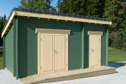 Madalam kõrgus 210cm,kõrgem 275cm.Katus kiviprofiil plekk.Puit peaks olema immutatud kaitsevahendiga.Seinad värvitud halliks.Fibo plokkidest postvundament(plokid 60cm sammuga)