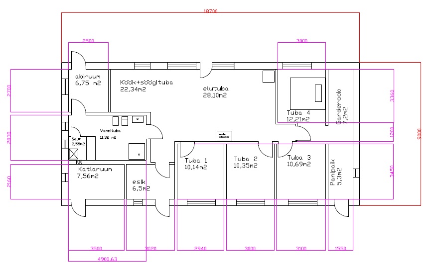 Katus - plekk (soojustuseks on kivivill 700-1000mm), katusekalle 30*.