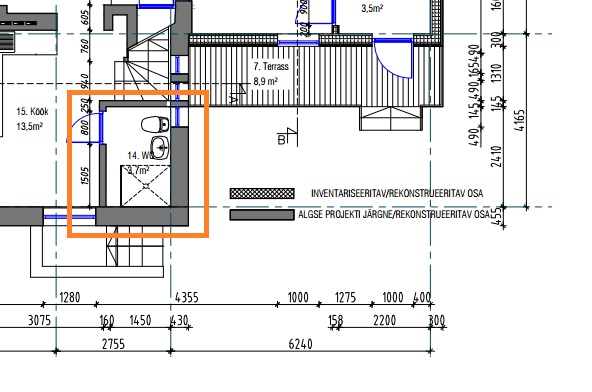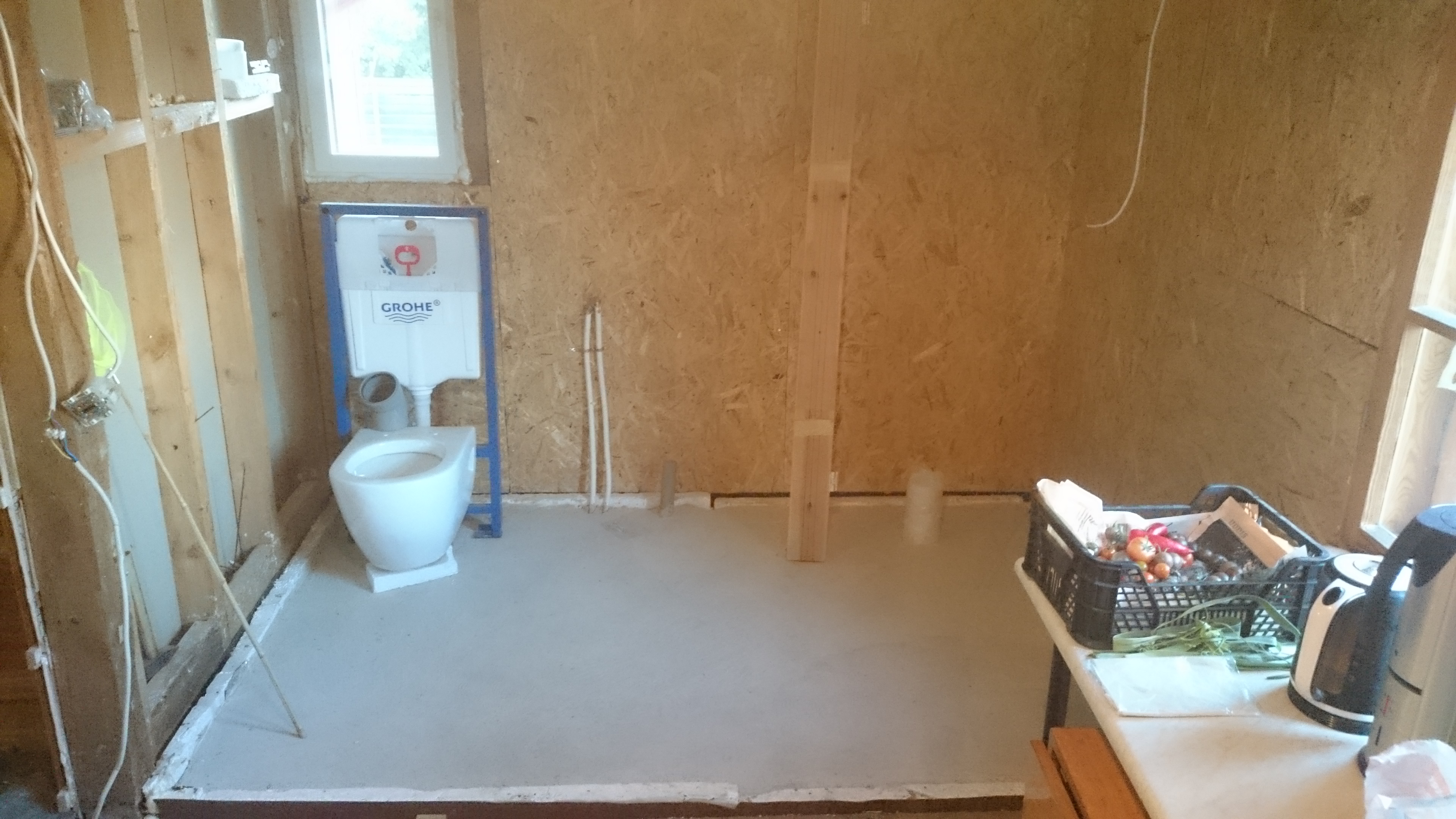 Hetkeolukord - majaremondi käigus lammutatud kuni aluspõranda ja välisseina kontruktsioonideni puhtaks. Hetkel on vannituppa paigaldatud põrandaküttetorustik ning see osa ka ära valatud. Kahes seinas (maja välisseinad) on soojustatud kivivillaga ning kaetud OSB plaadiga. Üks sisesein on hetkel karkassina olemas, teine on lammutatud ja tuleb üles ehitada (karkass ja kipsplaat ning katteks keraamiline plaat).