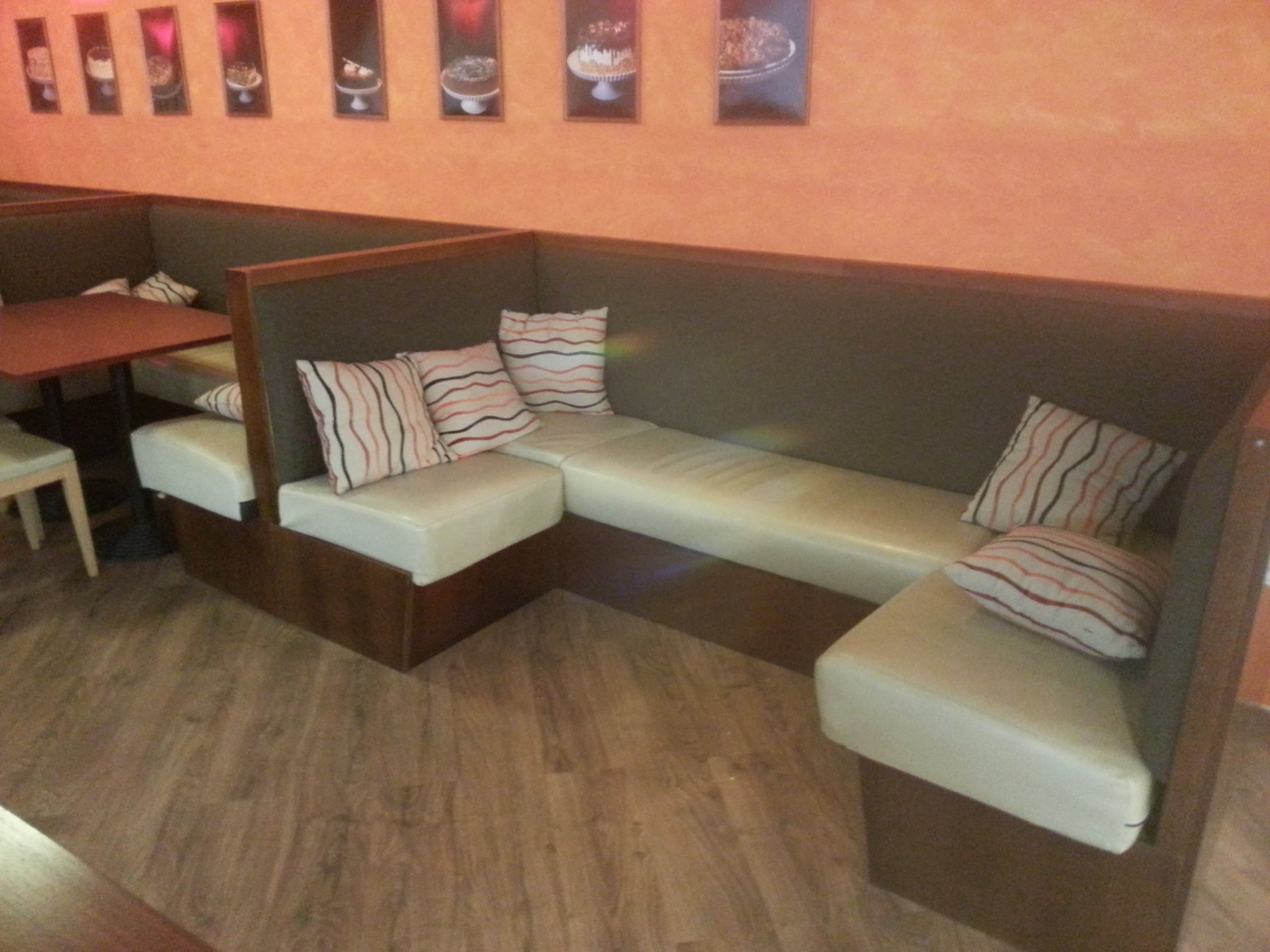 Kohviku sisseehitatud puitkarkassil diivanid, poroloon istmete ja seljatugedega ( karpraua kujulised ) 4 tk pikkusega 2,5 m, laiusega 1,3 m tuleb demonteerida. Ära vedada või utiliseerida.