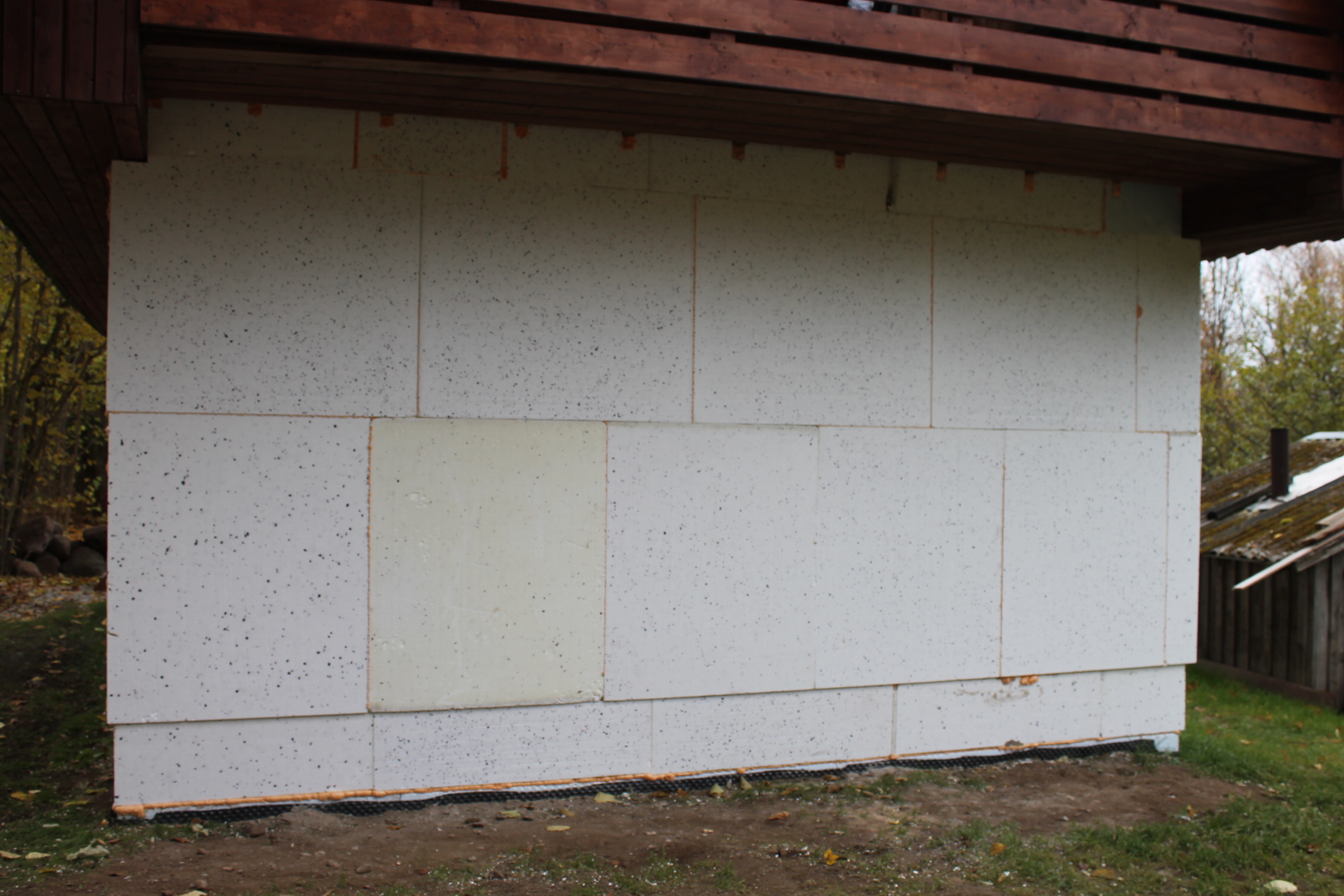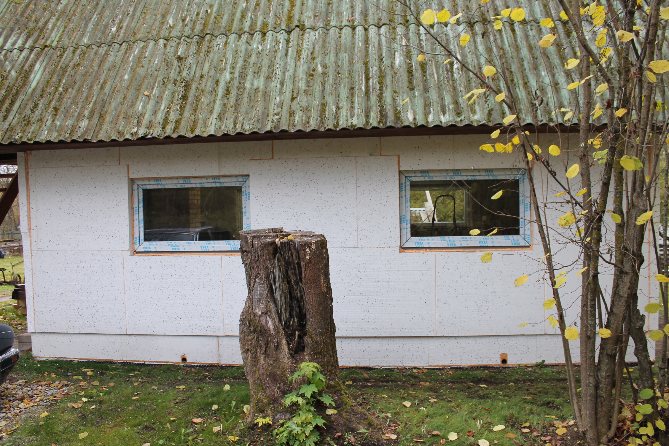 Värskelt penoplastiga kaetud maja välisfassad vajab krohvimist.