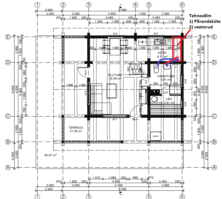 Põrandaküttetorud tuleb vedada joonisel toodud tehnoruumi (joonisel toodud punane kast). Samuti tuleb vedada ka 3 veetoru samasse ruumi.