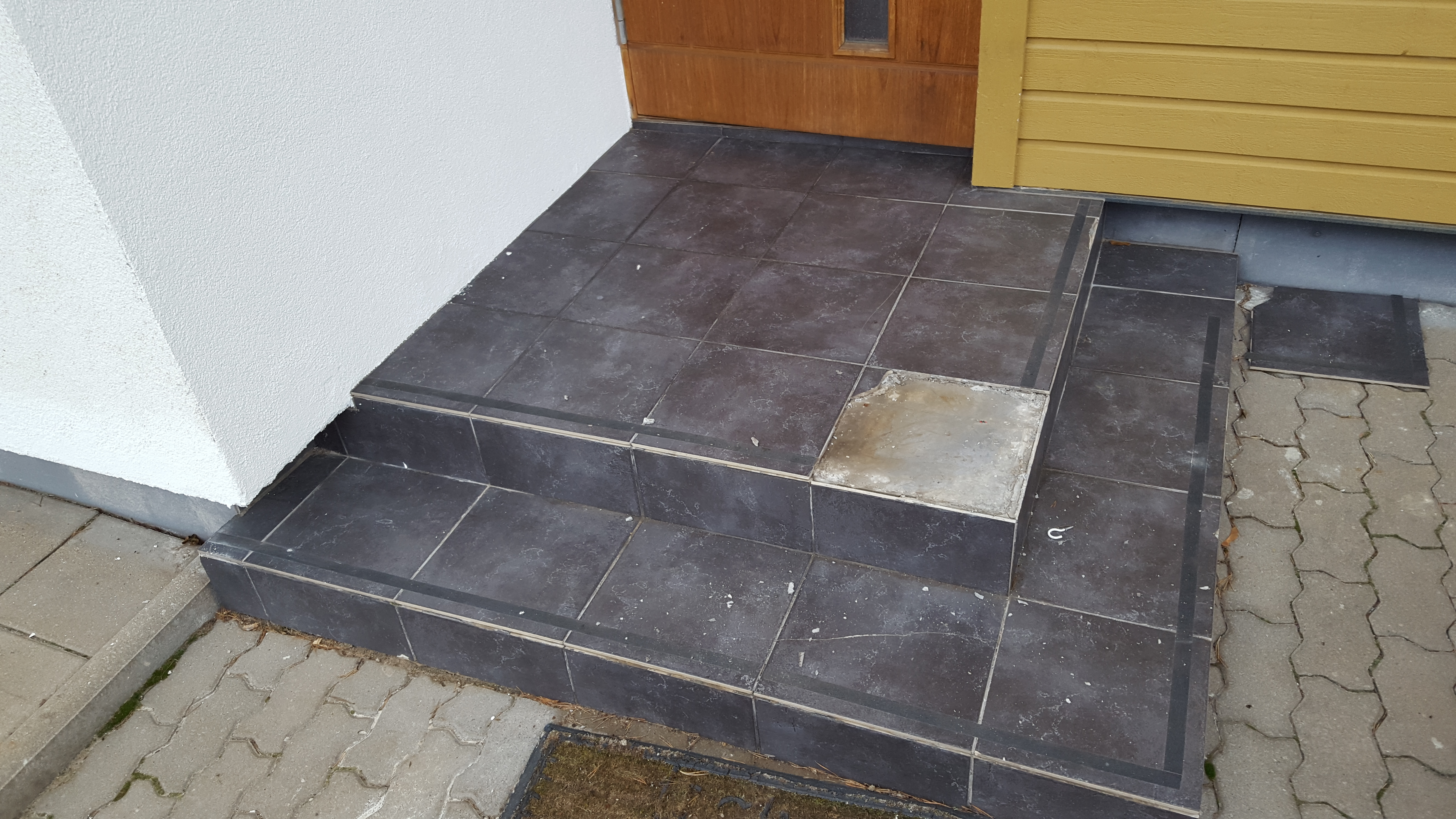 Eramaja 2 astmega välistrepi vanade plaatide eemaldamine ja uute plaatimine. Vajadusel tasanduskihi valamine. Trepi suurus 1500 mm x 1500 mm.