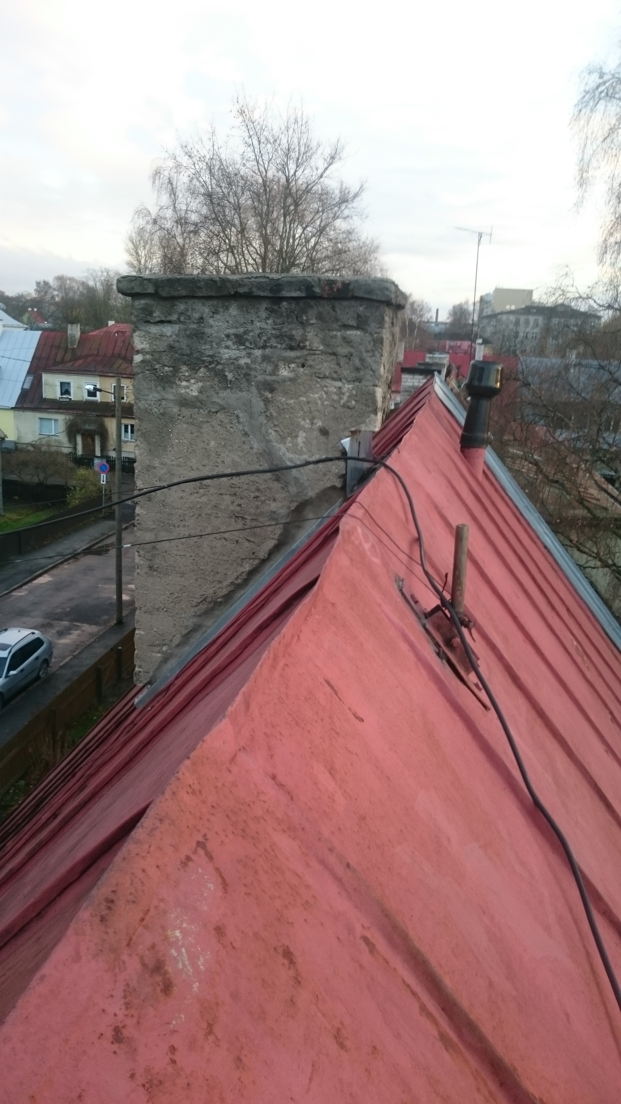 Kahekordse kivimaja plekkkatusel on üks korstnaplekk paigaldamata jäetud.