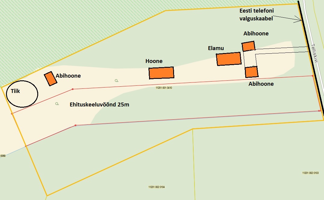 Lisasin ka eskiisi umbkaudsete hoonete-, sissesõidu tee -ja tiigi asukohtadega. Tõenäoliselt tuleks vastavalt planeerija soovile nendes kohtades teostada tihedamad kõrgusemõõtmised. Täpne soov selgub siis, kui olen projektile planeerija leidnud.
