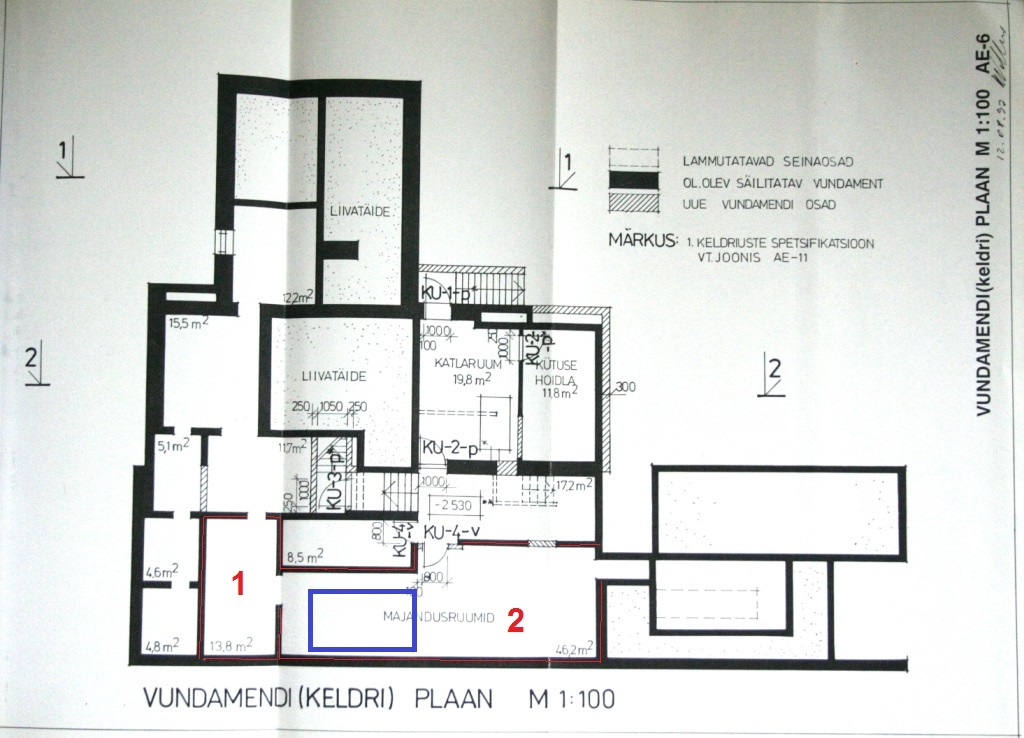 Keldri lae kõrgus on ~2m, ruumide pindala kokku 60m2, värvida vaja ainult joonisel punasega toodud ruumide seinad (2tk) ning laed, välja arvatud sinisega ala, mida ei tule värvida. (vt. lisatud keldri plaan).