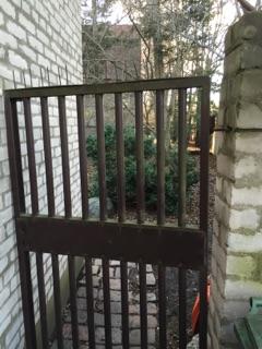 4) parandada ära vajunud õuevärav. Värav metallist ja kinnitub telliskivimüüri sisse, kuid kinnitus on sealt lahti tulnud ning värav ära vajunud (vt pilti). Müüri kivid on vaja lahti võtta, kinnitus korralikult uuesti paigaldada ja kivid tagasi laduda. Saab teha ainult plusskraadide saabumisel;