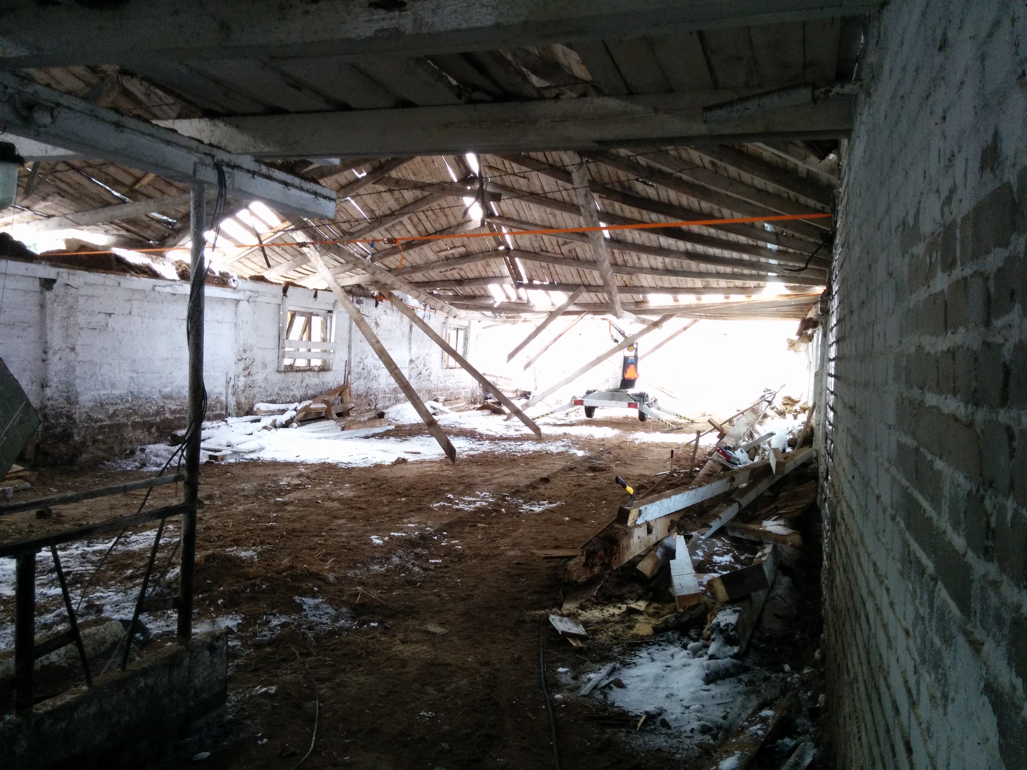 Olemasolevat katust on 900m2.Hoone mõõdud on 70m x 9m Katusekate on eemaldatud. Alles on jäänud sarikad,pennid ja laudis. Katuse konstruktsioonid on mädad. 900 m2-st on sisse varisenud ca 200m2. Eesmärk on jätta hoone seinad püsti, mis tähendab, et läheneda tuleb ettevaatlikult. Vajalik esitada töö plaan.