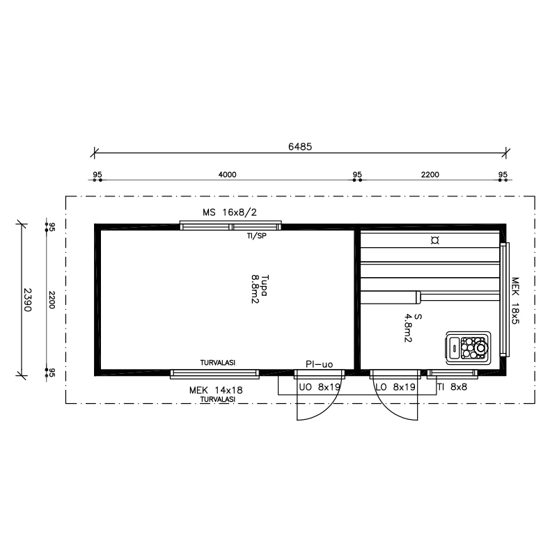 Tere, Meie pakkumine sisaldab 6,5x2,5 freespruss sauna (tapid üleulatuvad). Freesprussi paksus on 90mm ja kattev kõrgus 130mm. Hind sisaldab vundamenti, terviklikku hoonet(üks välisuks, üks siseuks, aknad, lae ja põranda soojustus, laelauad, põrandalauad, põranda karkass riietusruumil, katus, tuulekastid, katuse katteks kärgpapp). Saun väljast valmis (puidukaitsevahend puudub) ja seest riietusruum viimistletud, leiliruumi viimistlus (lava, ahi ja muu) jääb pakkumisest välja. Ootan teie küsimusi. Meeldivat koostööd.