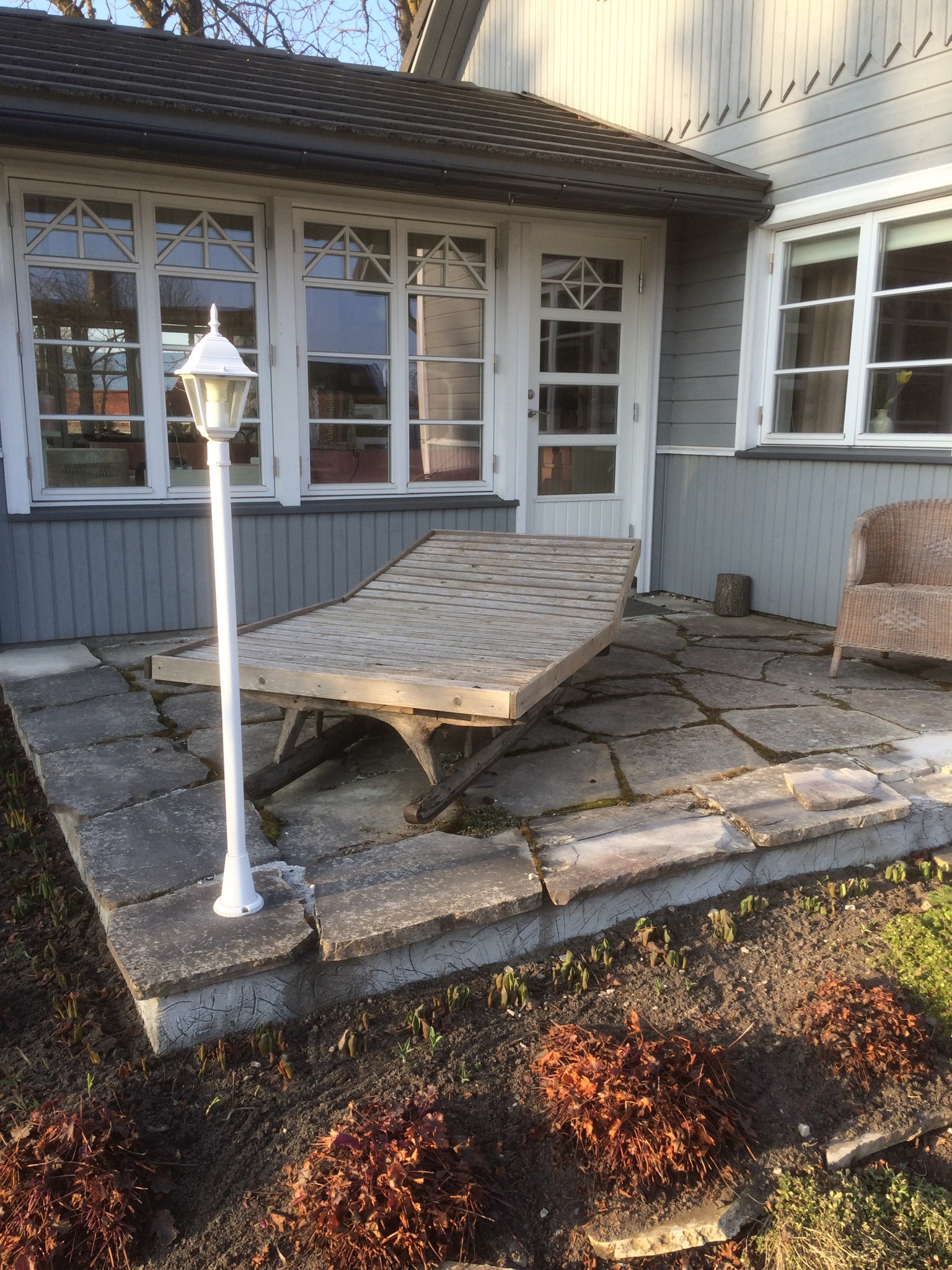 Hetke kirjeldus – terrassi ümbritseb plokkvundament, mis keskelt on täidetud tihendatud pinnasega. Aja jooksul on pinnas siiski vajunud ning lisaks kogub niiskust, mille tulemusena kivid on vajunud ja ka purunenud. Tööks on betoonplaadi valamine ja hilisem plaatimine.