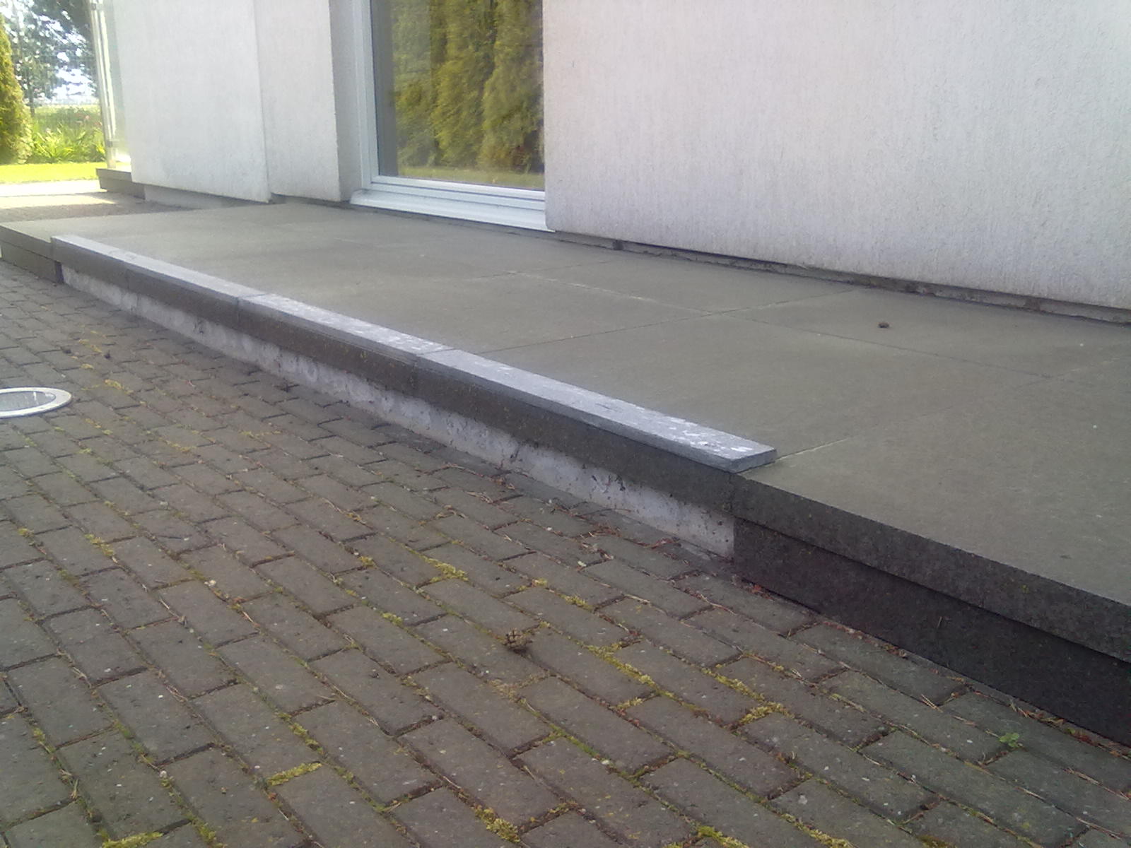 12. Terrasside ja majaesise trepi kokkupuute kohtadesse seintega graniidist porteplaatide 800x120x20 kleepimine, vuukimine, silikoonimine (plaadid on olemas 32 jm) ja äärte veekindel tihendamine: 22 jm. Sõlmlahenduse joonis (ct30-7) on lisatud lähteülesandele.