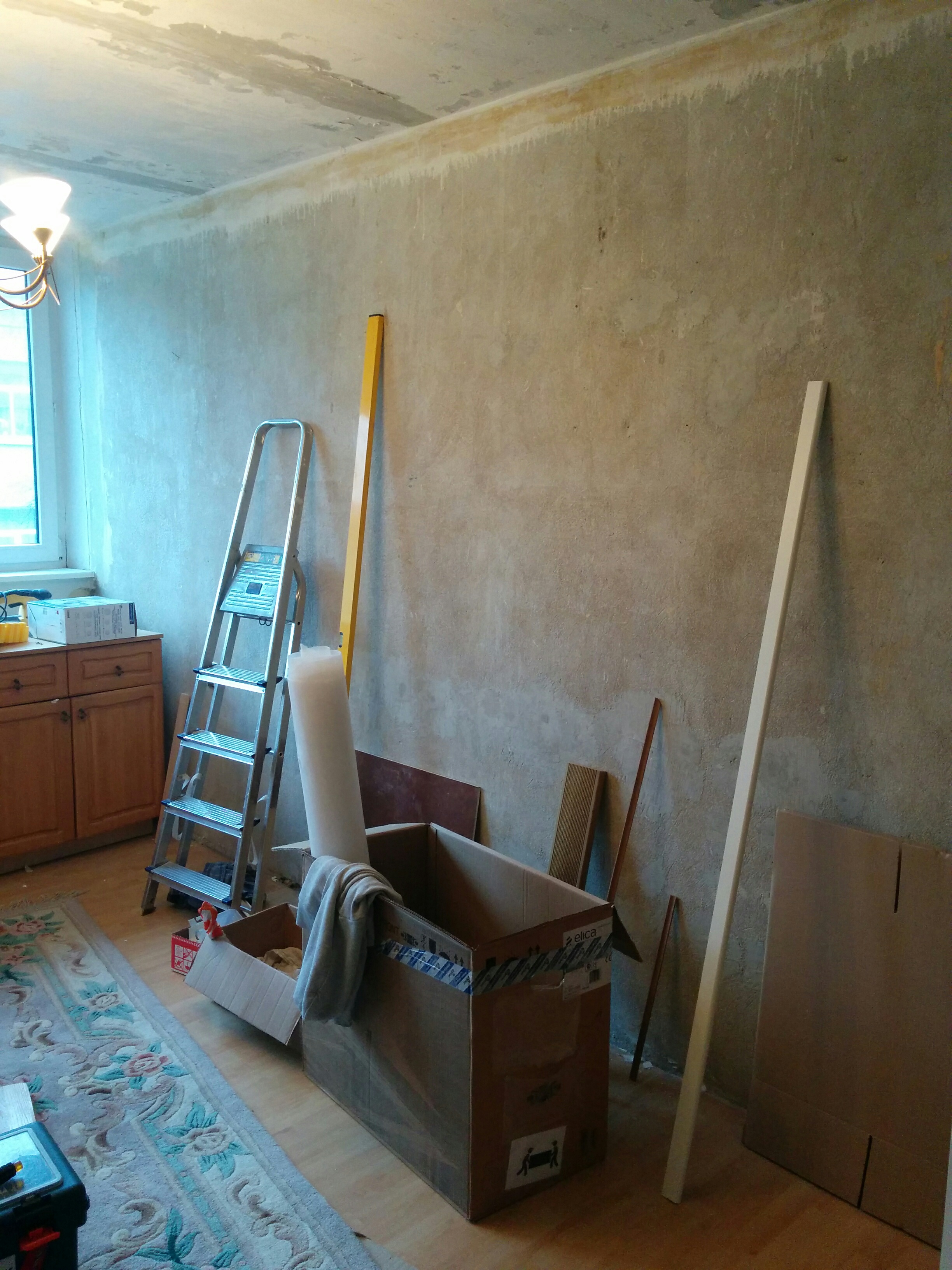 Seisukord (vt fotod): seintelt eemaldatud tapeet, krohvini puhas. Laelt eemaldatud tapeet. Põrandaliistud eemaldatud (põrand läheb hiljem vahetusse).