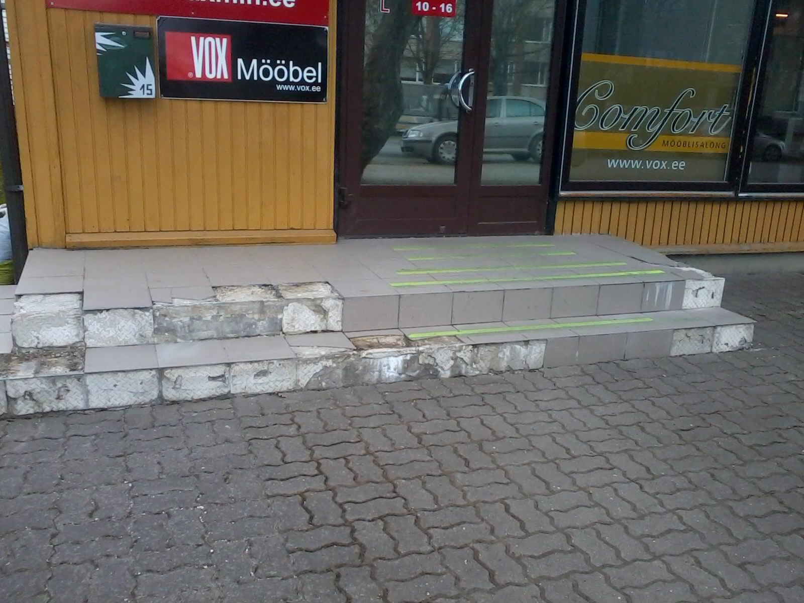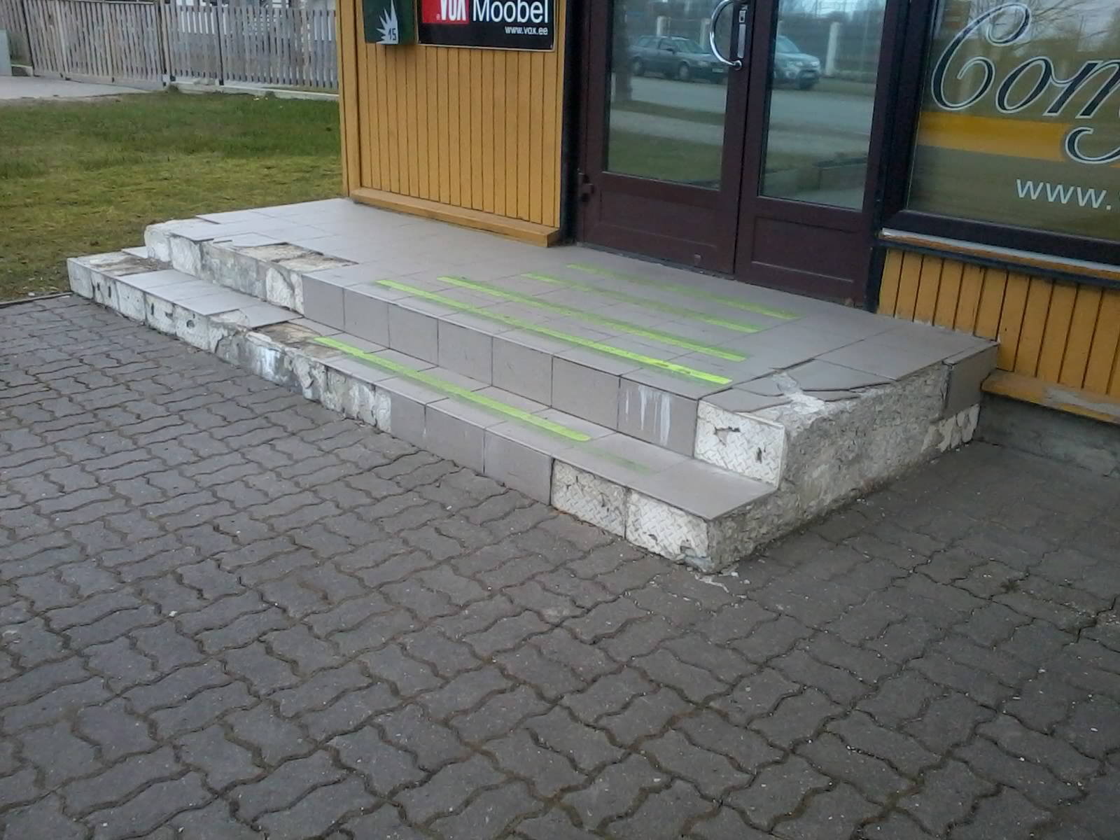 Välistrepp vajab remonti. Võib ka pealt katta graniidipuruga. Kui plaatida, siis peab olema kindlasti plaat mis 0 kraadidega libedak ei lähe. Trepi küljed ja astmete küljed ei pea olema plaaditud. Oluline, et trepp kestaks ja ei oleks libe. Kui küljed jätta plaatimata, tuleb need krohvida.