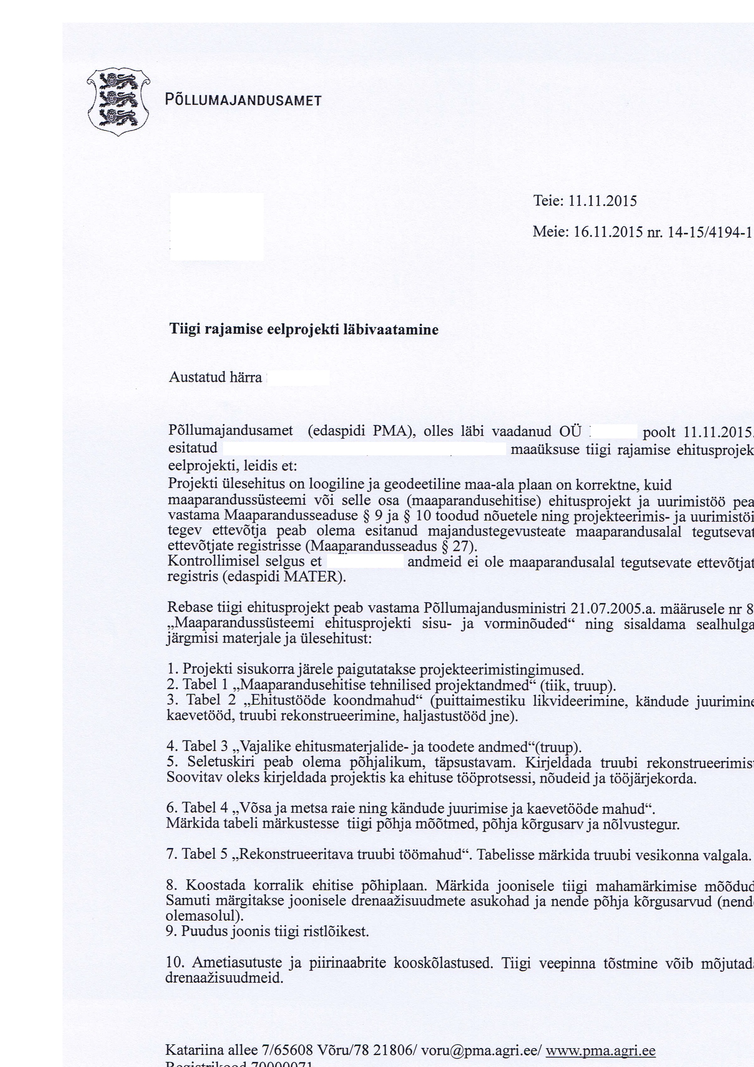 Vaja oleks täiendada tiigi eelprojekti, et põllumajandusamet välasjastaks loa tiigi rajamiseks. Põllumajandusameti luba on vajalik kuna tiik asub maaparandussüsteemi osas.