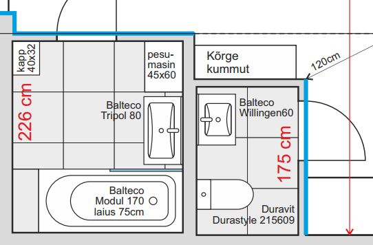 * Mööbel vannitoas: peegelkapp, valamukapp, vann, vanniklaas, pikk seinakapp. Mööbel WC's: WC pott, valamukapp, peegel.