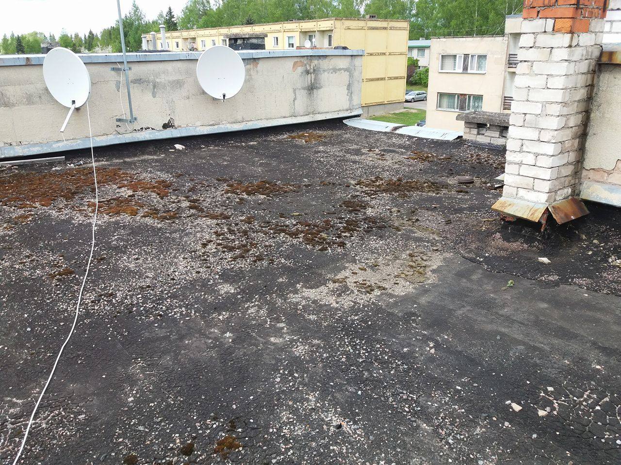 Katusel on väga vana bituumenrullist kattematerjal. Tarvis uuem kiht peale panna ja pärast räästa juurest veeplekk ka tagasi kinnitada.