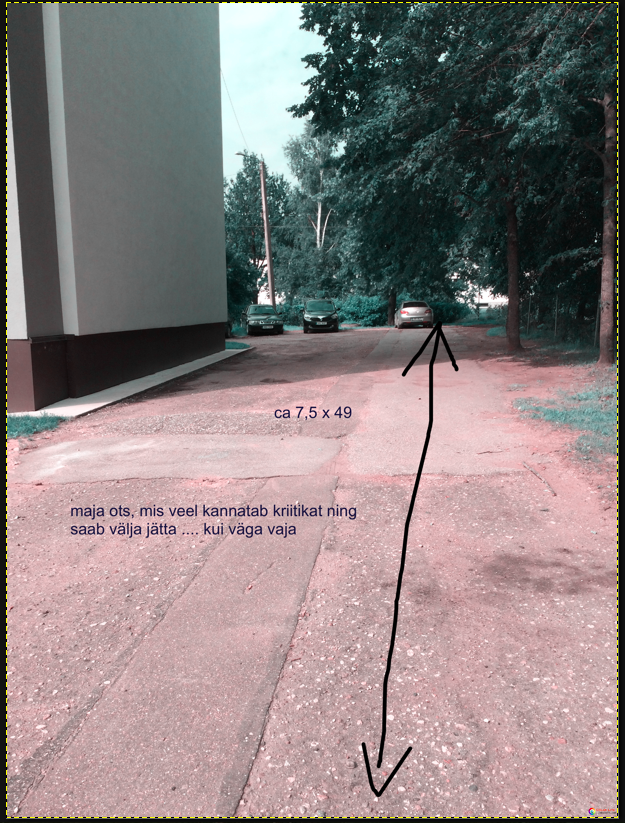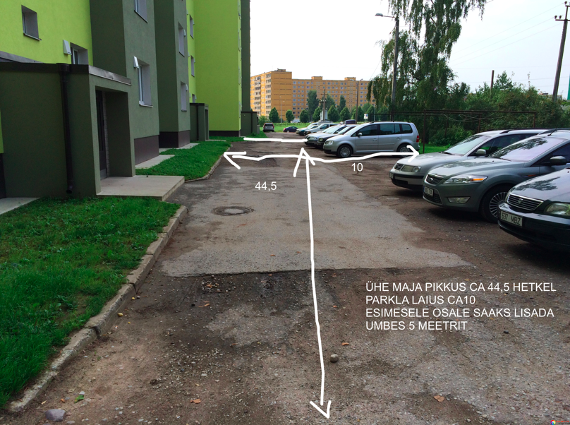 Tegelikuses soovib ühistu parklat laiendad, et saada juurde parkimiskohti. Olemas oleva osa ja majaesise uue (laiendatav) osaga kokku on töömaht ca 1203m2. Laiendusele minev osa on hetkel haljasala. Kui rahast peaks jätkuma, siis maja külgedel on samuti laiendamise võimalus, ehk jällegi raha küsimus. Maja mõlemal küljel on parkimisplatsiks ruumi, ühel pool 330m2 (pinnaseks on kruus, eelistaks selle korda tegmist) ja teisel 368m2 (pinnas on asfaldi all, vajadusel saab selle välja jätta). Kui pakkumus rahaliselt ühistule sobib, siis oleks töömaht kokku ca 1533m2 või1900m2.