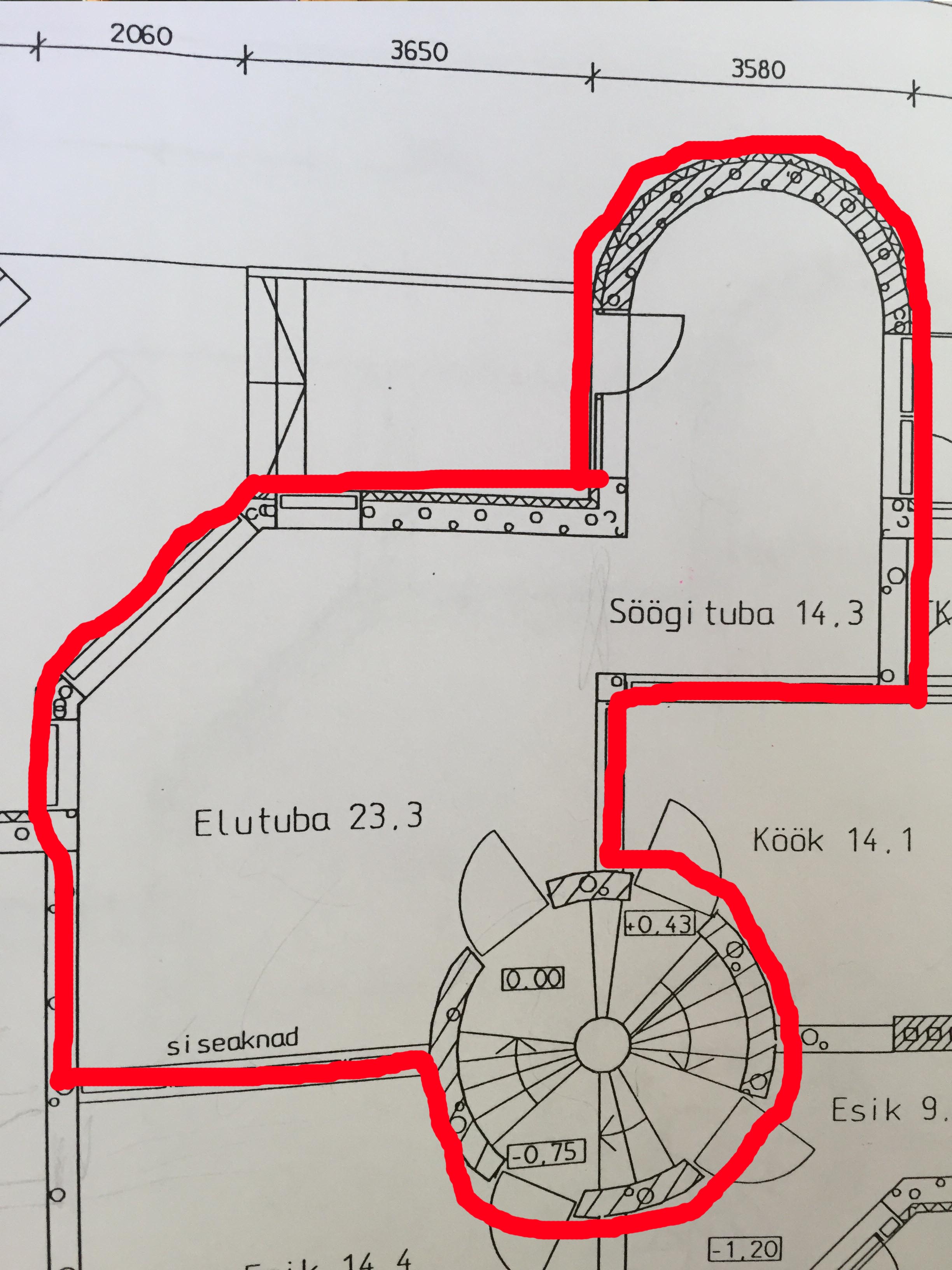 2) Plaatimine ja parkett. Plaatida 14,3m2 ja parkett panna 23,3m2. Lisaks pigaldada parkett ka keerdtrepile, millel on 21m2 pealmist pinda ja 8m2 külgmist pinda.