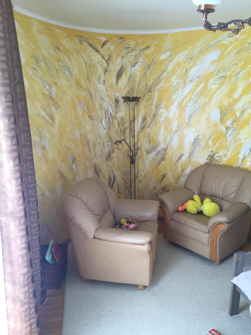 4) Seinte tapeetimine ja värvimine. Lihvida struktuurne värv, kruntida 70m2, sellest hiljem värvida 30 m2 ja tapetseerida 40m2.