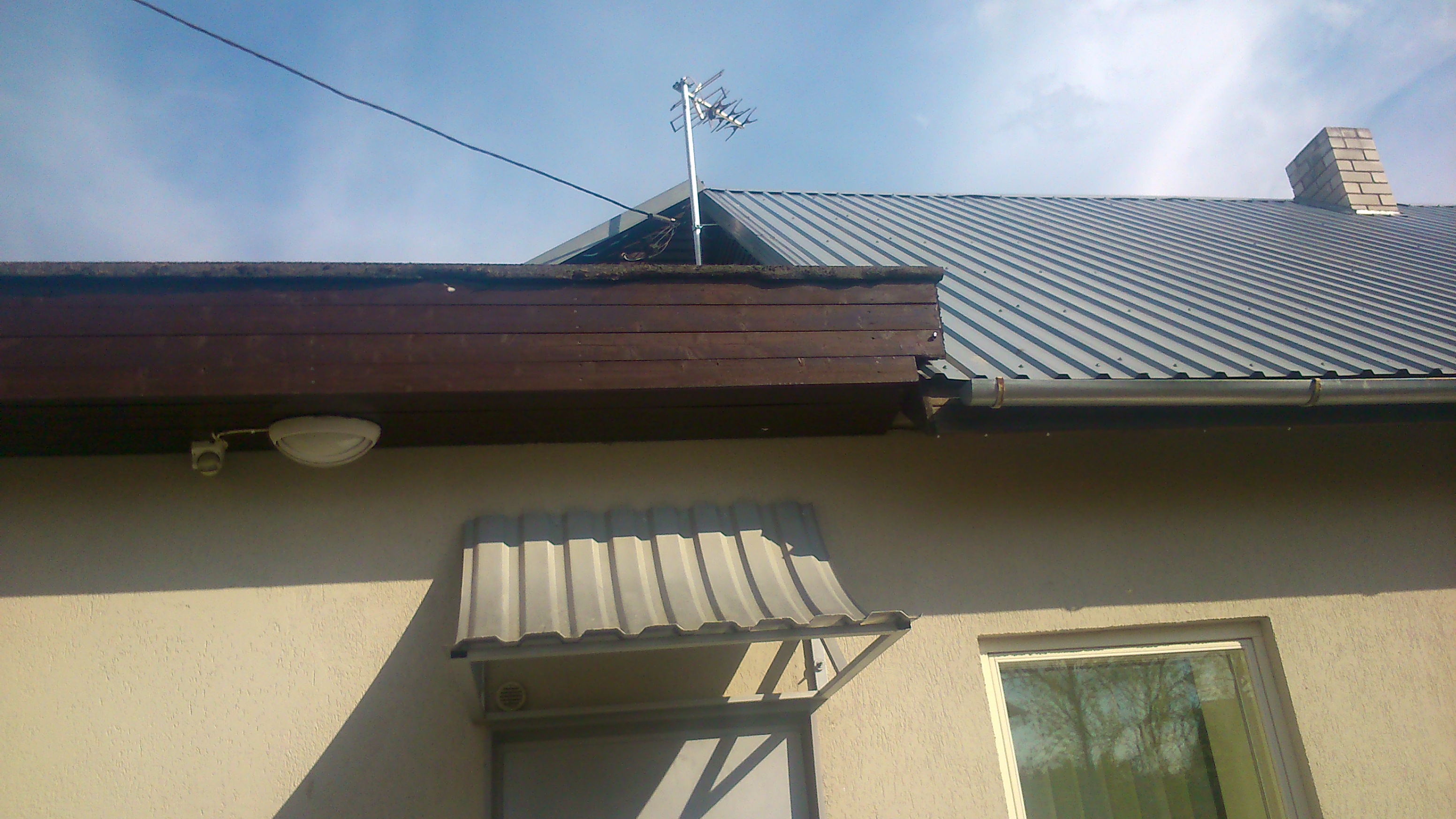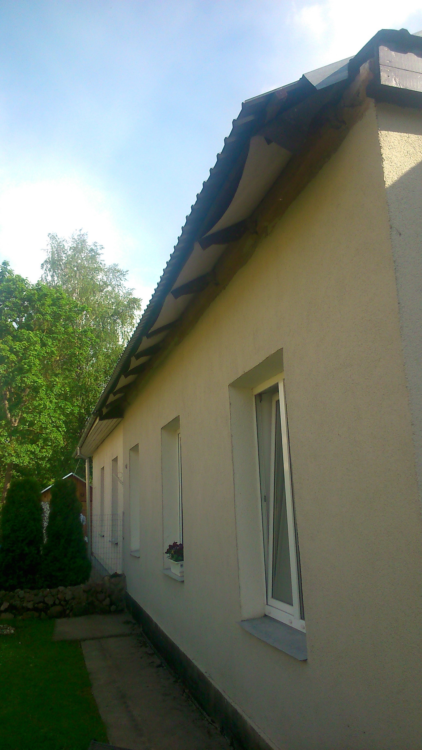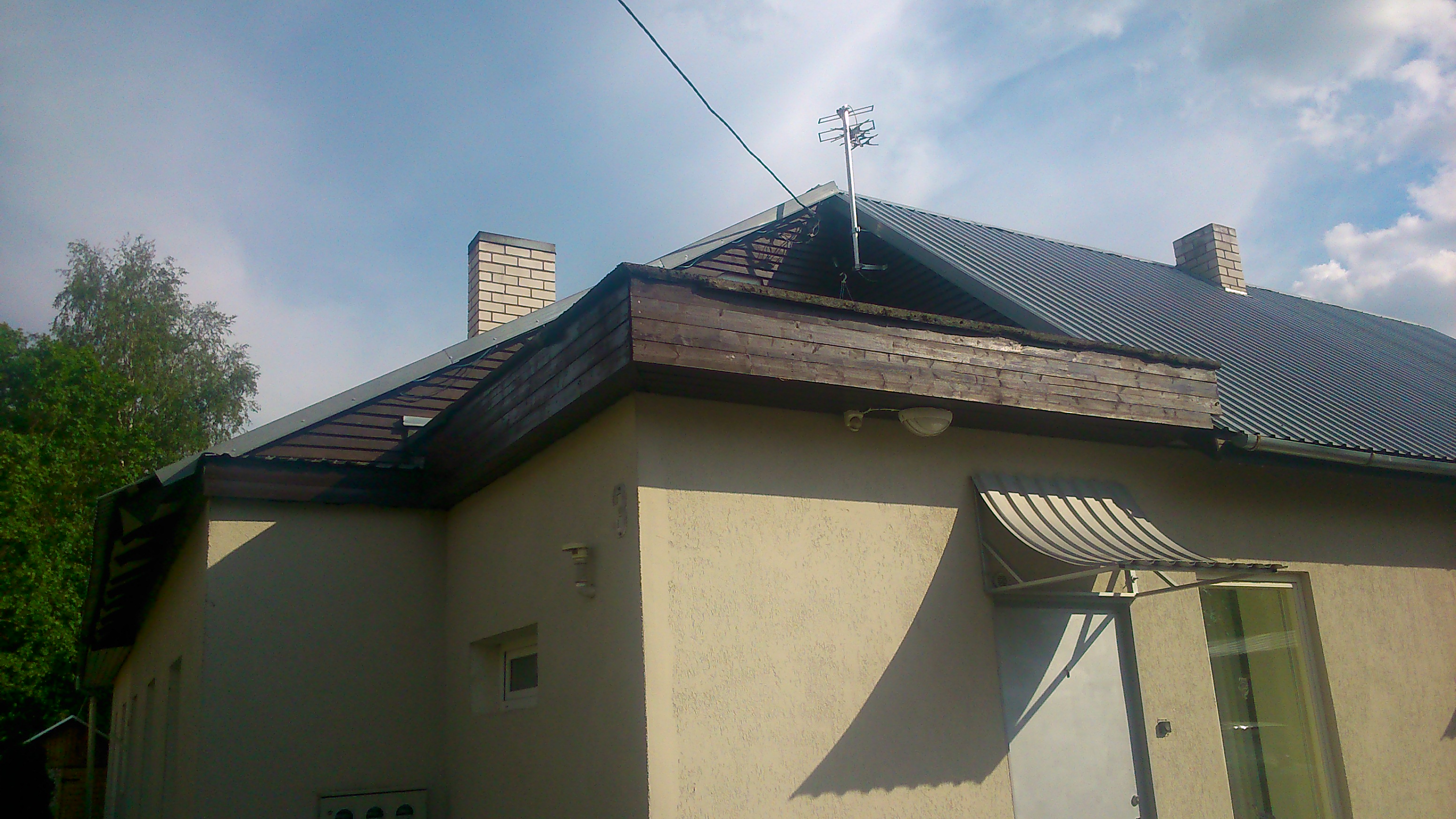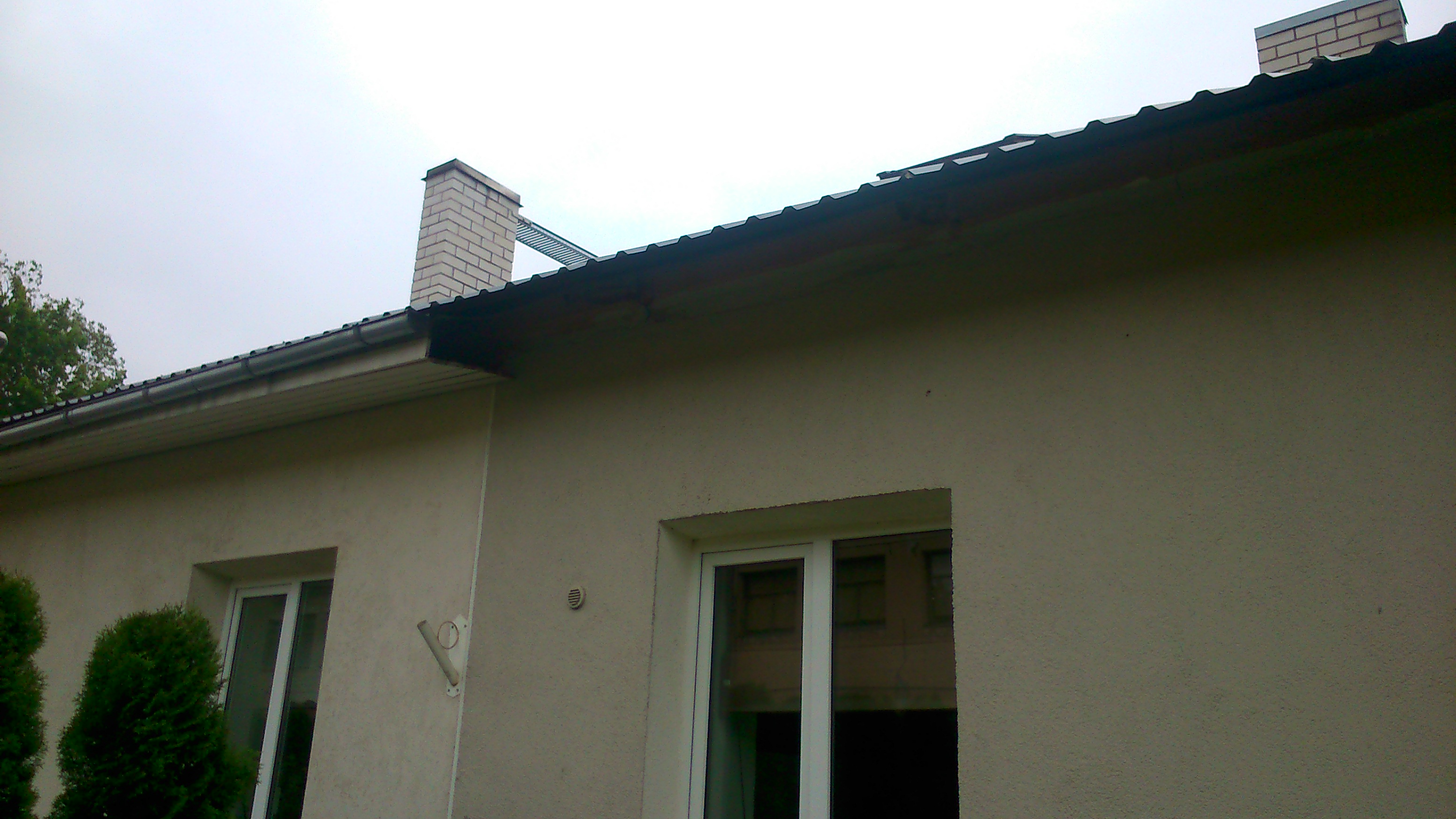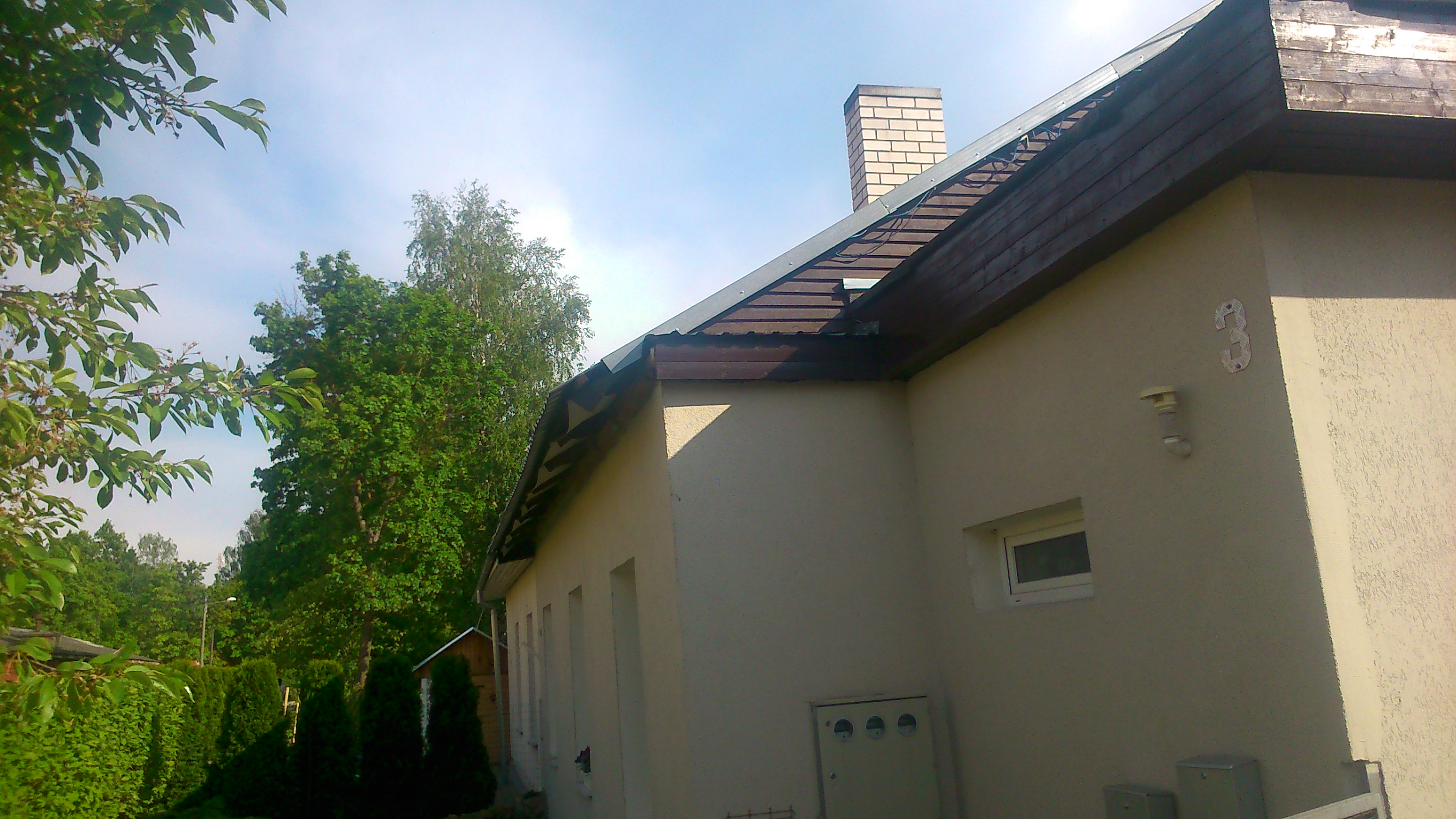Vaja ehitada tuulekast pikkusega 10m (üks pikk sirge) kõrvaloleva majaosaga samasugune ja paigaldada vihmaveerennid tuulekasti külge. Üks allavoolu toru vasakusse otsa, ning ~7m vihmaveerenni lameda katuseääre alla kahte külge äravooluga olemasolevasse paremasse renni.