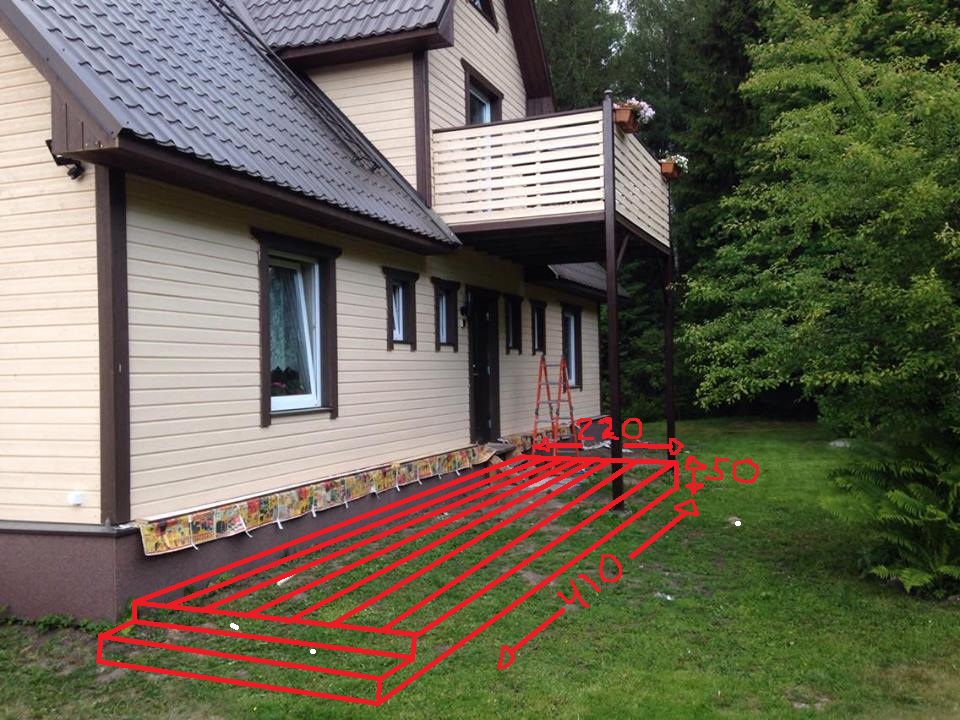 Terrassi ehitus, mis peaks tulema maja äärde ja millest peaks tulema aste kõrgmeale (peaukse ette) ja ka aste alla poole põhitasandit, et igalt poolt oleks võimalik maha astuda. Mõõdud pikkus:410cm laius:220cm kõrgus: u 50cm