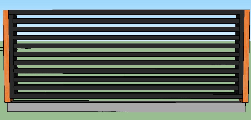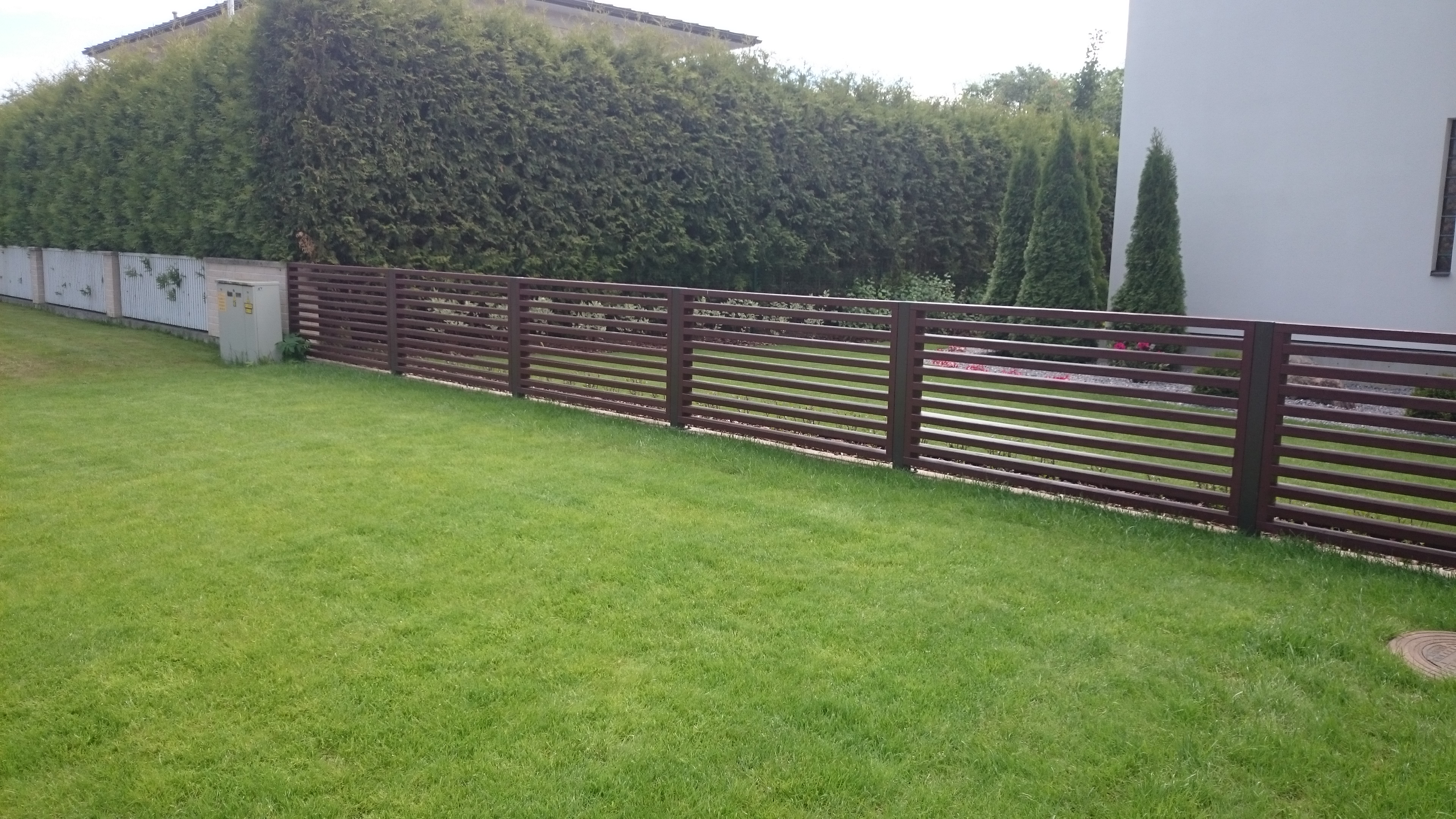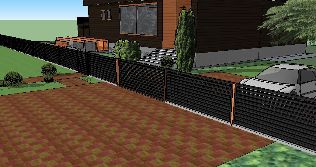 Materjal peab olema järgmine: oranžid (RAL 1004) kuumtsingitud postid (80x80mm), must (Pinotex Ultra+krunt) horisontaalne hööveldatud pruss 45x95mm (väravatel 45x45), betoonist vundament (savine pinnas). Posti samm orienteeruvalt 2,5m. Haljastust aia kohal ei pea säilitama.
