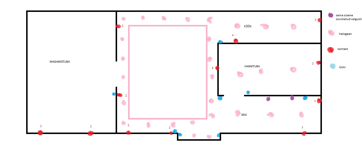 Sooviksin korterisse uusi kaableid, valgusteid ja kontakte. Kogu materjal on minu poolt, sooviks hinnapakkumisi tööle. Lisan ka pildi, mis näitab korteri plaani ära, kus midagi asub.