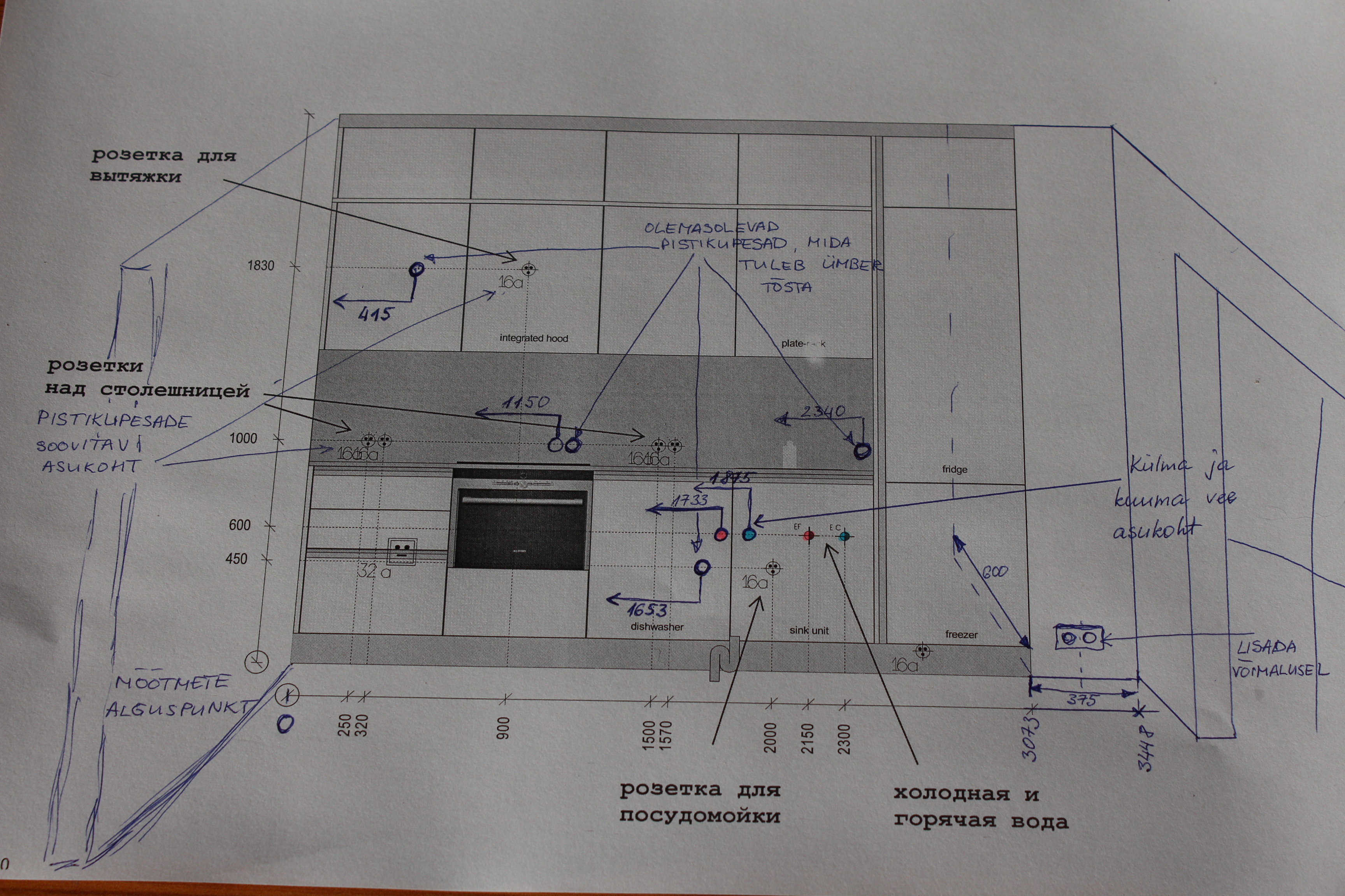 Vaja muuta kööginurgas enne köögimööbli paigaldamist olemasolevate pistikupesade arv ja asukoht ning muuta veekraanide asukoht. Soovime lisada ka pistikupesad paremasse seina.